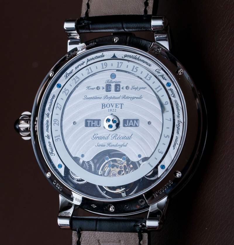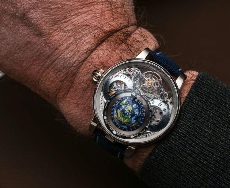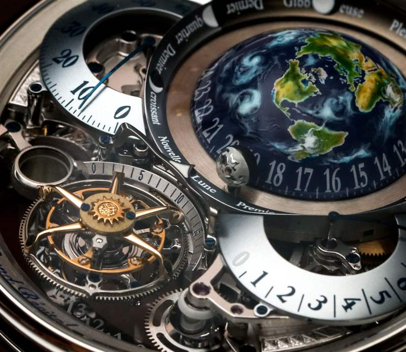 與其他同類時(shí)計(jì)的情況一樣,手表內(nèi)部的機(jī)械機(jī)芯和表盤之間沒(méi)??有明顯的區(qū)別。兩者都連接在一起,因?yàn)榭潭?、刻度盤和其他指示器直接構(gòu)建在機(jī)芯本身上。除此之外,播威 Récital 22 Grand Récital 還大量使用手工精加工、雕刻和繪畫。半成品的地球儀展示很漂亮,而且是手工精心繪制的。繪畫過(guò)程中使用的最好的視覺(jué)技巧是夜光琺瑯漆的應(yīng)用。播威過(guò)去曾嘗試過(guò)這種類型的發(fā)光涂料,并取得了巨大成功。您可以在這篇文章中看到一些圖像,說(shuō)明在 Récital 22 Grand Récital 的表面已適當(dāng)?shù)爻淙胱銐虻墓饩€后,表盤上會(huì)在黑暗中發(fā)光。大多數(shù)具有這種傳統(tǒng)風(fēng)格和復(fù)雜性的時(shí)計(jì)都沒(méi)有那種類型的“燈光顯示”來(lái)與它的主人分享。話雖如此,告訴時(shí)間的系統(tǒng)并不完全是發(fā)光的。手表僅以 24 小時(shí)格式顯示時(shí)間,小時(shí)是夜光的,但不是逆跳分針。