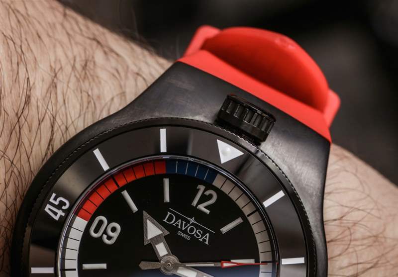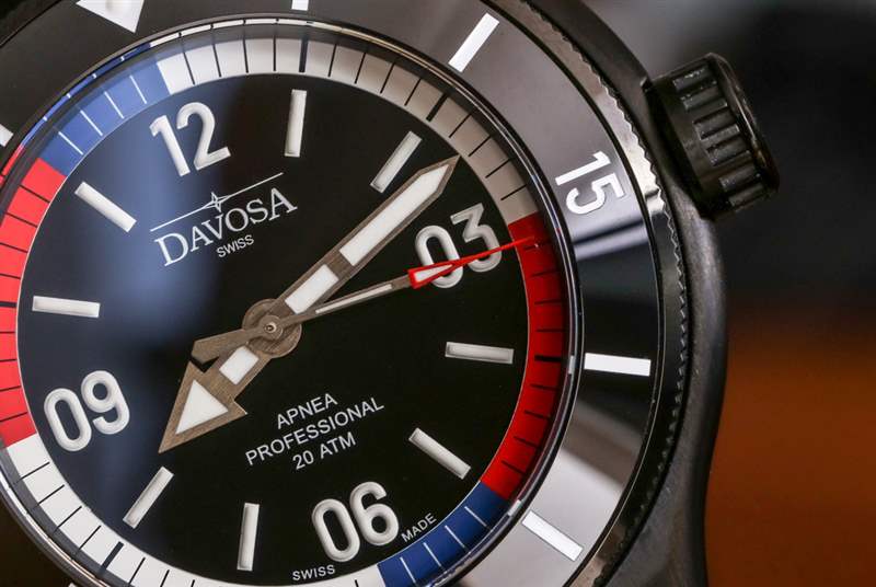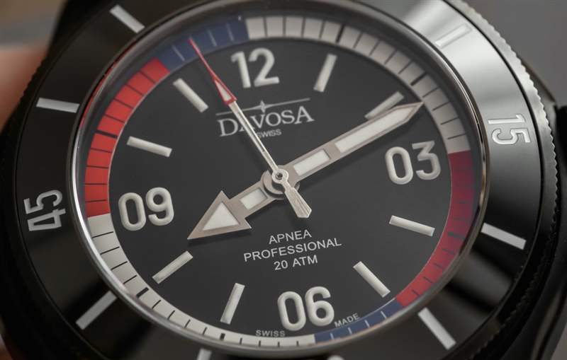 對于那些不打算用你的手表練習(xí)自由潛水呼吸技巧的人來說,有漂亮的顏色可以看,當(dāng)然看起來像是一系列國旗顏色(從美國到法國等等)。Davosa 否則選擇使表盤干凈和對稱。沒有日期,由于面部比例合適,材料和對比度的使用良好,易讀性非常好。表盤本身可能不如 Apnea Diver 的整體構(gòu)成那么原始,但它工作得非常好。使用刷過的指針是正確的選擇,我喜歡在時標(biāo)上使用厚厚的 Super-LumiNova 涂料。外部的“呼吸暫停環(huán)”也被應(yīng)用,因此它有助于給表盤一種很好的深度感。