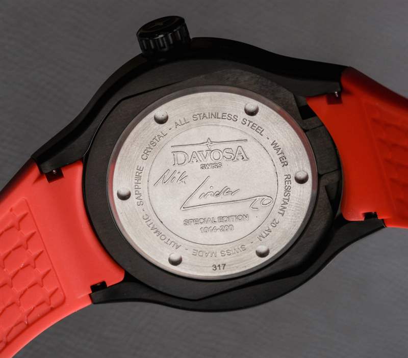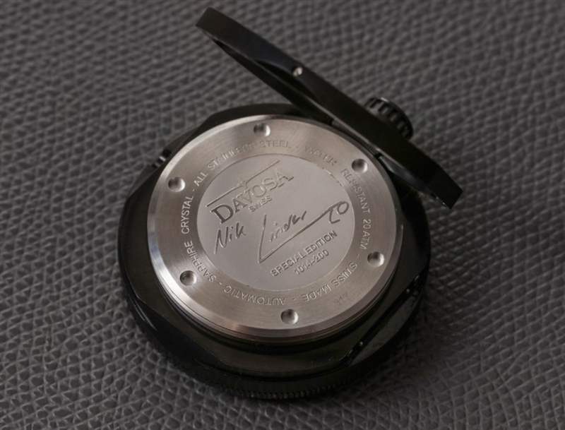 表殼背面是著名的自由潛水員 Nik Linder 的浮雕簽名,Davosa 與他一起開發(fā)了 Apnea Diver 手表。他是少數(shù)佩戴這款腕表并能充分利用其功能的人之一。然而,這并不能完全解釋為什么 Davosa 包含可以從表帶上取下內(nèi)殼的功能。這也恰好是手表寬 46 毫米(厚 12.5 毫米)的原因,但實際上它的磨損程度與您希望的一樣。我也喜歡手表在手腕上的方向如何讓表殼稍微支撐一下,這樣一目了然。