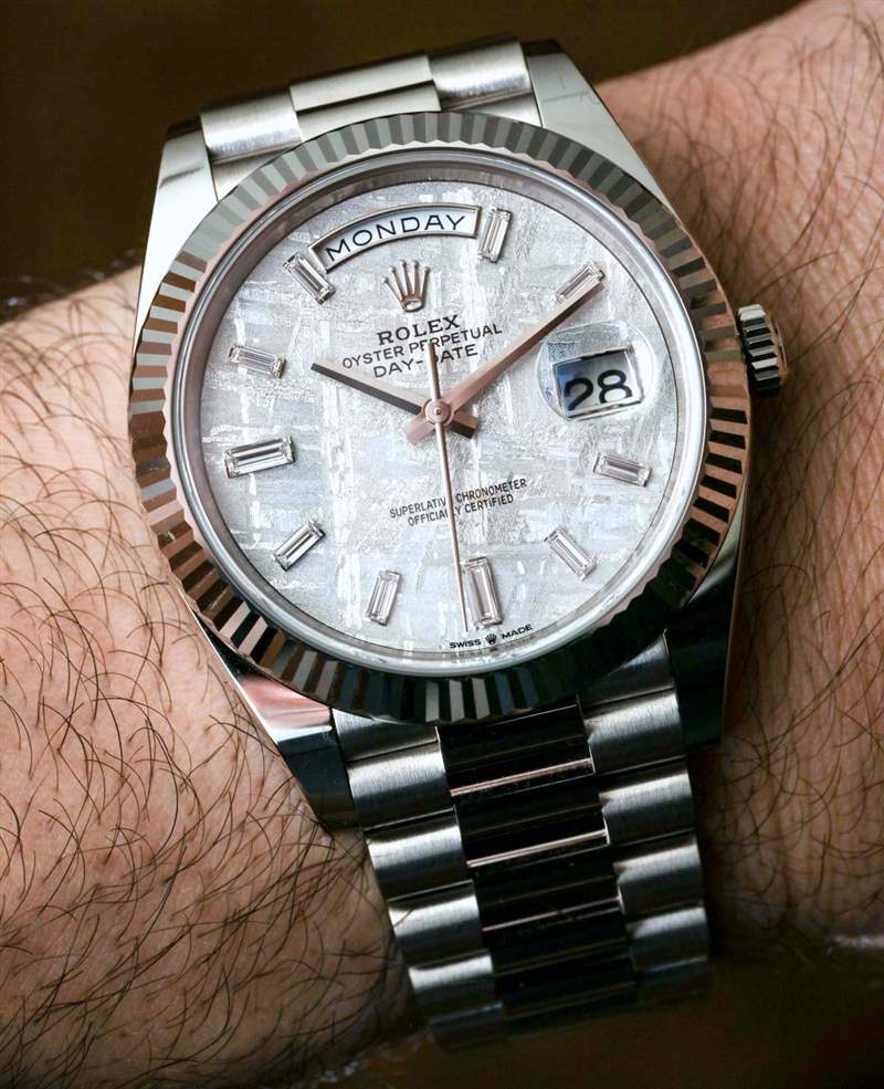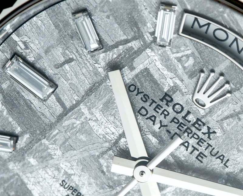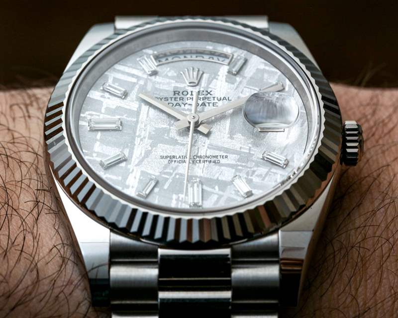 我發(fā)現(xiàn)隕石表盤是勞力士 Day-Date 40 主題的美麗而引人注目的補充。勞力士只使用最優(yōu)質(zhì)的材料,尤其是其高端系列,因此您會得到一塊既清晰又實用的絕妙天然材料。這款腕表的一大魅力在于將稀有材料積聚在一個產(chǎn)品中,因為它結(jié)合了 18ct 白金、鉆石和隕石,所有這些都被認為是珍貴的材料。雖然這些材料的實際市場稀缺性存在爭議,但將這些材料整合在一起的目的之一是提高手表的內(nèi)在價值。