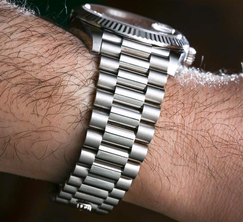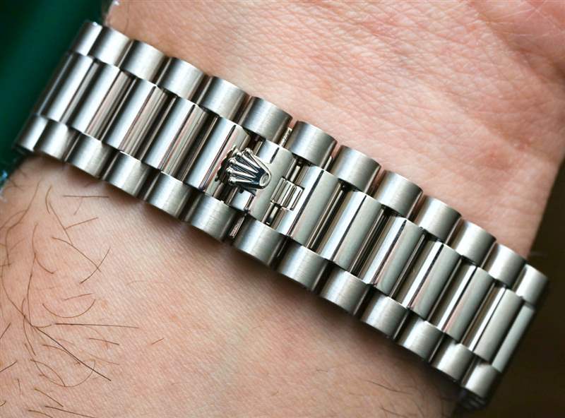 Day-Date 40 ref 寬 40 毫米,不是特別厚。228239 穿得很好看。手表在視覺上比實際要小的原因之一是表鏈的寬度似乎縮小了表殼的尺寸,這符合勞力士強調(diào)總統(tǒng)表鏈的愿望。這款圓形三鏈式手鏈戴在手腕上非常舒適,得益于“隱藏”的展開式表扣,從頭到尾看起來都一樣。