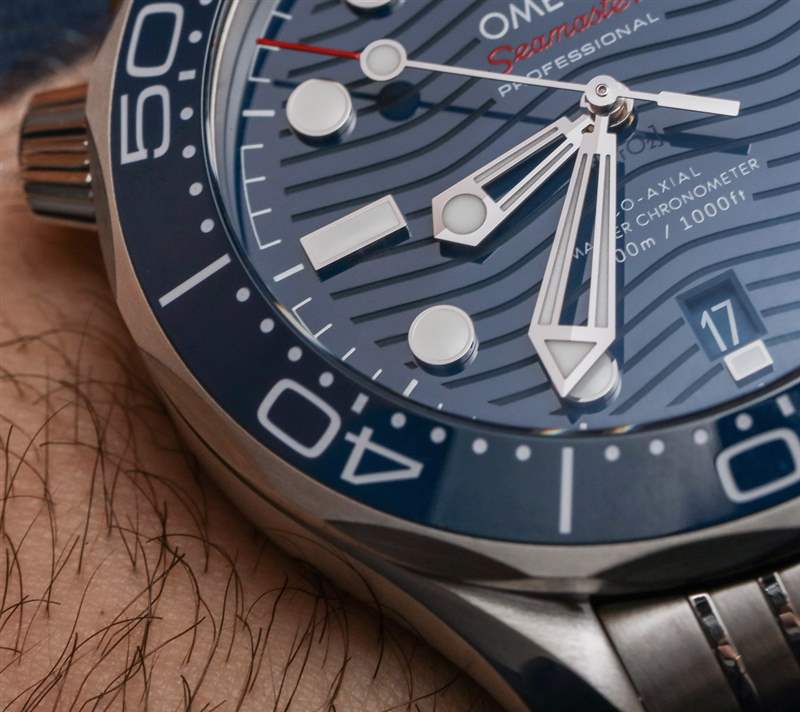 2018 年款 Seamaster 300M 表盤的一項變化是日期窗口的位置,現在位于 6 點鐘位置(相對于 3 點鐘位置)更加對稱。歐米茄還告訴我們,存在新規則,即潛水表需要在所有 12 小時標記處都有發光點。因此,海馬 300M 在日期窗口下方有一個小時標。根據這些新規則,鑒于大多數型號的日期窗口取代了 3 點鐘位置的小時指示器,Submariner 不會通過。