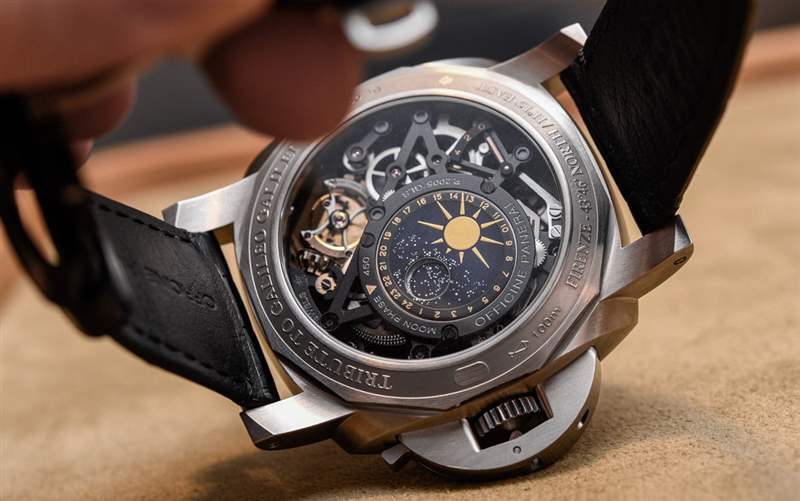 當沛納海首次推出 L’Astronomo Tourbillon 時,他們聲稱它的靈感來自伽利略·伽利略(出于明顯的天文原因)。除了時間等式復雜功能外,從手表的正面看,手表的天文功能并不容易看到。當然,表盤外圍還有日出和日落指示器,至少需要復雜的日歷功能。將 PAM920 背面翻轉,您會看到這款手表的最新元素之一,即月相指示器——這與之前 2010 年型號的星圖不同。在太陽的對面,月相盤本身非常精美,并且每 24 小時轉動一次,作為時間的額外指示。