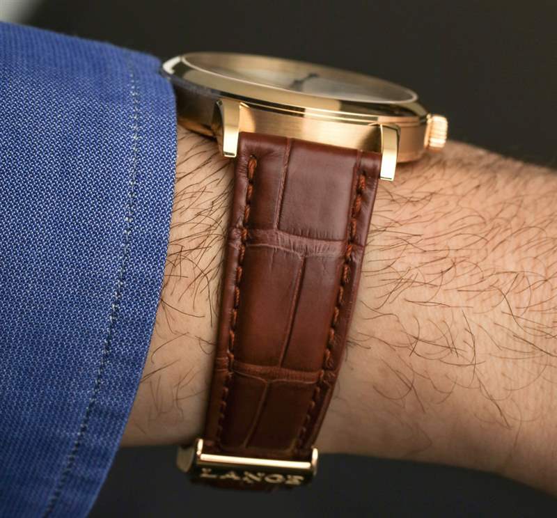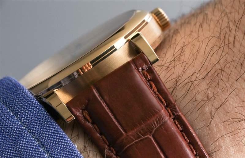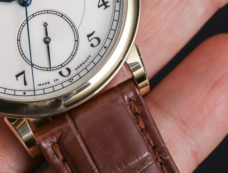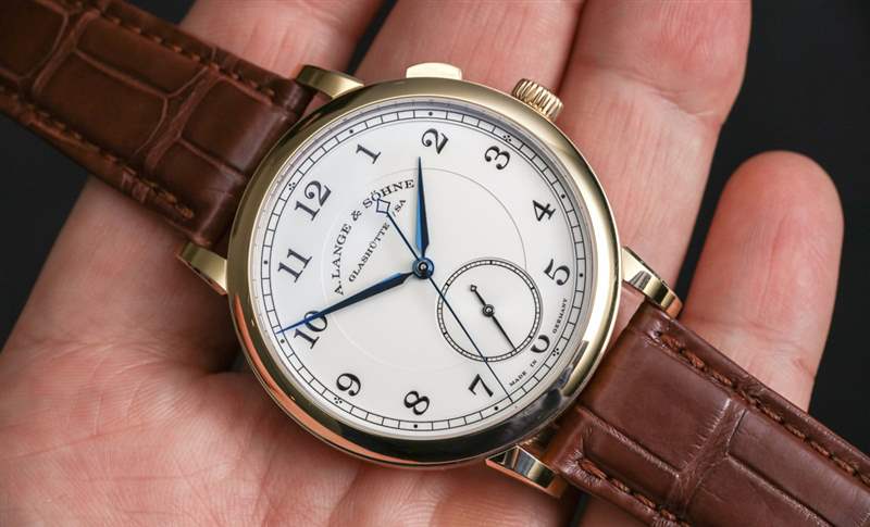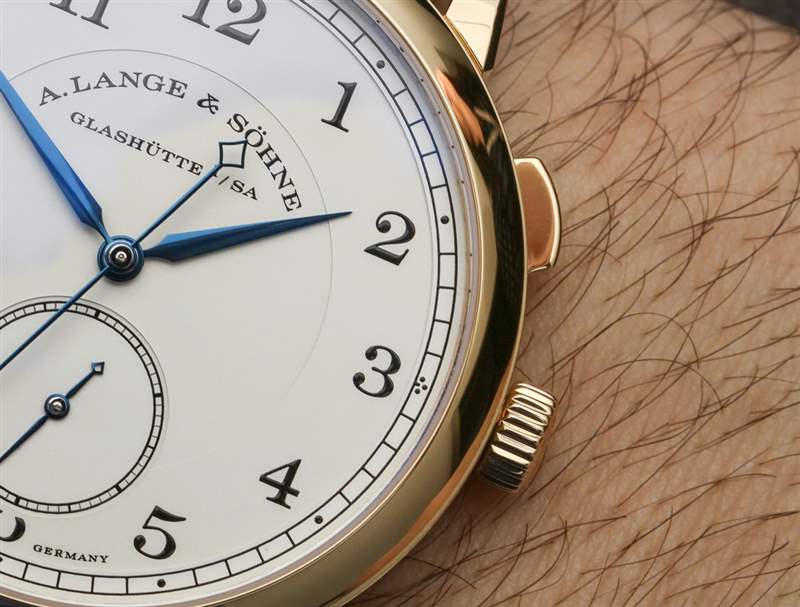 讓我解釋一下跳秒并發(fā)癥。位于表冠上方的按鈕用于啟動(dòng)和停止中央跳秒針的運(yùn)動(dòng)。沒(méi)有重置或類似的東西。指針沿著正常的順時(shí)針路線開始和停止。名稱的跳躍部分指的是中央秒針“滴答”的事實(shí)。這通常被稱為“跳動(dòng)”秒針,但這個(gè)詞并不受歡迎,因?yàn)闋I(yíng)銷人員不喜歡它。他們也經(jīng)常不喜歡它,因?yàn)樘鴦?dòng)的秒針也恰好看起來(lái)像大多數(shù)石英手表上滴答作響的秒針的運(yùn)動(dòng)。話雖如此,1815 Homage to Walter Lange 的表盤確實(shí)有一個(gè)掃秒針——在小表盤上。
