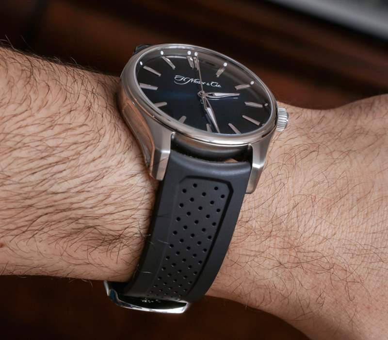 此型號 3200-1200 的表殼尺寸為 42.8 毫米寬,但由于其 15 毫米的厚度(很大程度上是由于水晶)和表耳的重量,手表磨損很大。這是我認為任何人都可以佩戴正裝手表的最大值——它看起來最適合在太空游艇上的半正式場合。需要像這樣具有冒險精神的正裝手表設計,盡管并非總是對所有觀眾都成功。作為正裝表,有些人可能會認為 H. Moser & Cie 將 Pioneer 做得太大了。作為一款運動手表(表殼有旋入式表冠,防水深度達 120m),人們可能會認為它有點太無聊和拘束,感覺不到男子氣概。在很多方面,這款 H. Moser & Cie Pioneer Center Seconds 手表讓我想起了Bremont AC I(此處為 aBlogtoWatch 評論).?兩者基本上都是運動手表,外觀優雅,搭配舒適的(藍色)橡膠表帶。廣告訊息廣告信息結束