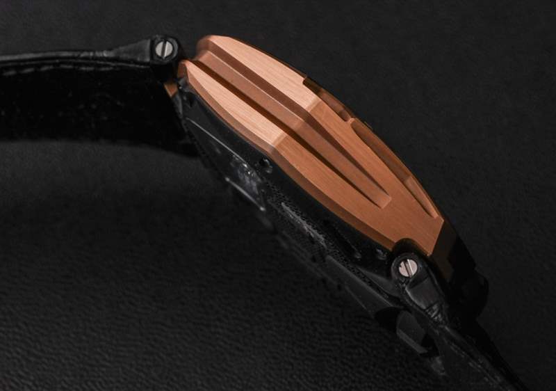 表殼的細節很好,混合了角度和線條,從大多數角度來看都很有趣。表殼的大部分是拉絲 18k 紅金,而啞光黑色鈦金屬片則用于表背和表冠組件。表冠本身位于表殼的 12 點鐘位置,值得慶幸的是,它很大并且在手表仍在佩戴時易于上鏈。雖然作為自動手表,您并不需要一直為它上弦。