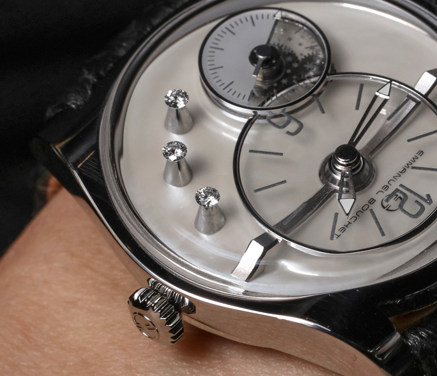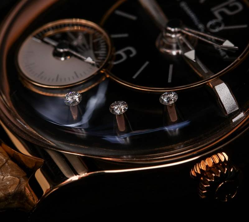 鉆石是 EB02 腕表的可選元素。如果您選擇鑲鉆表款,而不是將它們鑲嵌在表殼上或用作時標,則將三顆迷人的寶石鑲嵌在表盤右側的小圓錐上。它們不提供特定的功能元素,但增加了手表的藝術。沒有鉆石,他們通常坐的空間是空的。購買如此昂貴的手表的買家往往對價格不太敏感,因此對 EB02 上的鉆石的偏好實際上與個人品味有關。
