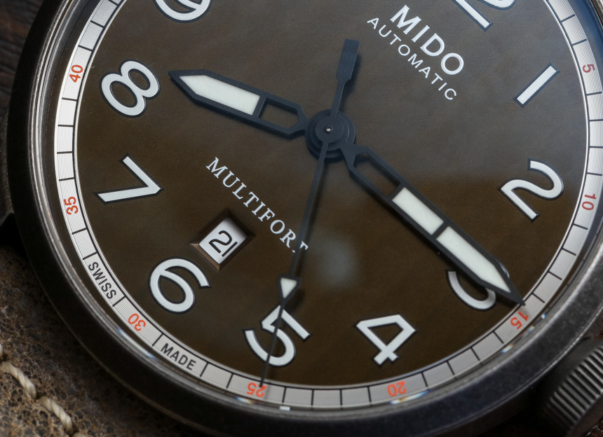 許多 Multifort 手表共有的吸引人的設計元素之一是表盤上的 C?tes de Genève 風格(拋光條紋)裝飾,以垂直條紋的形式出現。日內瓦條紋是機械機芯表面的一種常見裝飾形式。在表盤上看到這一點的情況要少得多。美度不久前決定在 Multifort 手表的表盤上使用垂直日內瓦風格的條紋,我認為它繼續運作良好。這與非常容易看到的 lume 繪制的阿拉伯小時數字和指針相結合,使表盤具有吸引力且非常清晰。我也喜歡時針與分針略有不同,從而進一步強調了易讀性。