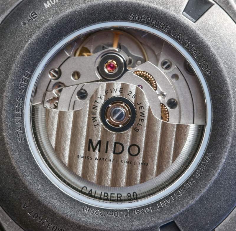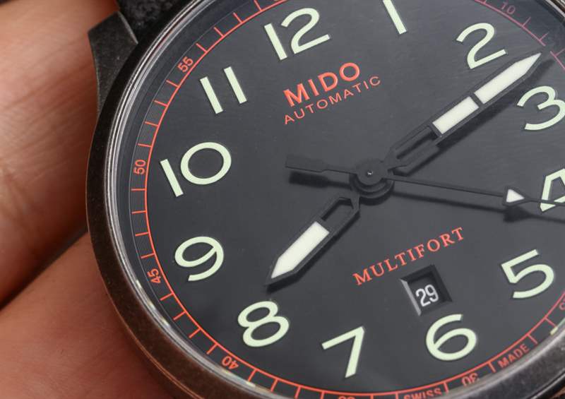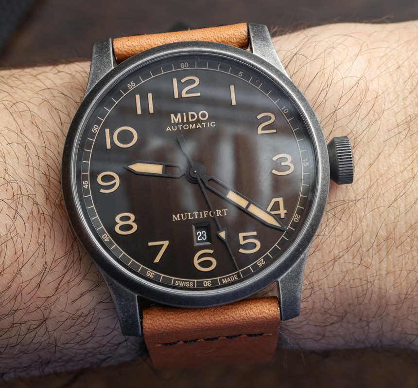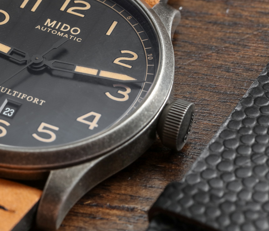 44 毫米寬,這是市面上較大的 Multifort 三針手表之一,但由于其主要是復古外觀,大表殼尺寸比“太大”更有趣和時尚。表殼表面處理類似于槍色金屬,但略有不同。Mido 顯然是在追求一種陳舊的外觀,試圖發揮這樣一種觀念,即某些經典手表設計在以“陳舊風格”呈現時也看起來很酷。是的,這是純粹的時尚,但手表確實提供了經典手表的吸引力,非常注重現代時尚的考慮。