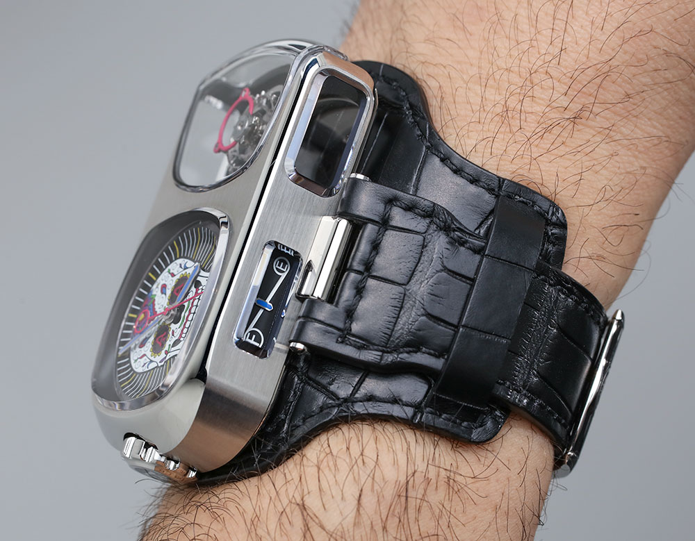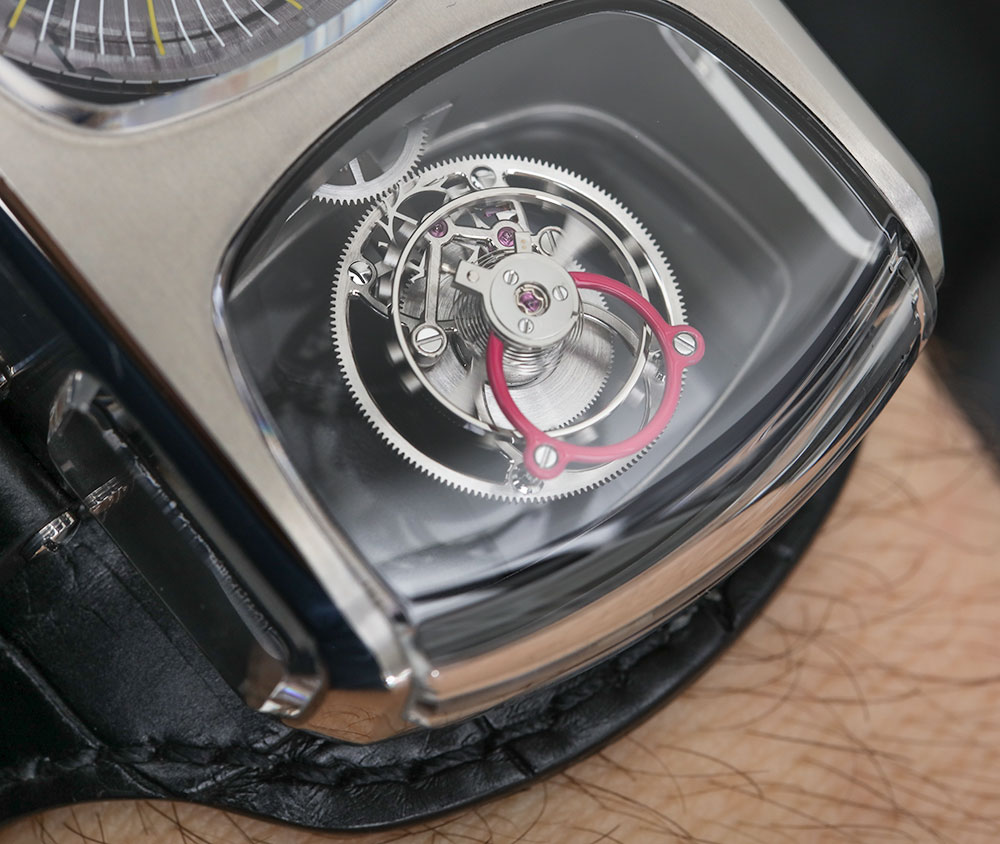 為了與 Calavera 頭骨的紫色、藍色和綠色相得益彰,飛行陀飛輪組件的一部分被涂成洋紅色。“電動剃須刀形”精鋼表殼除了在這些區(qū)域和手表的指示器(指針)上進行了彩色處理外,大部分色調都比較樸素。顏色令人驚嘆,細節(jié)也是如此。這是一個奇妙的色調和線條組合。盡管我認為手表的概念非常愚蠢,但我確實喜歡它戴在手腕上的感覺。卡拉維拉萬歲!