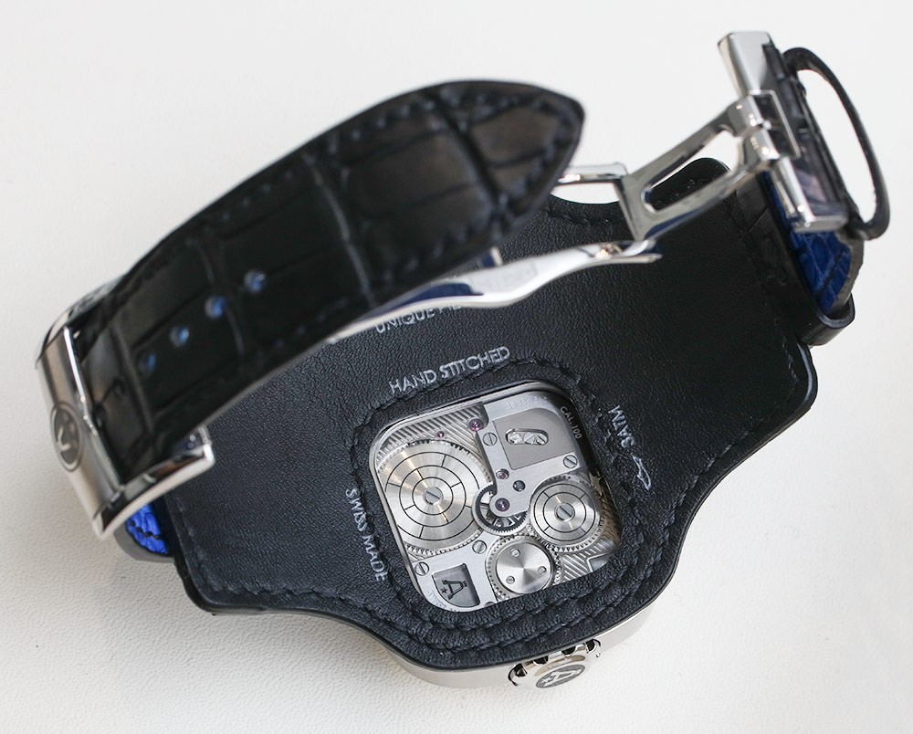 黑色鱷魚“袖口”表帶比以前的表帶更大但更舒適。這是另一個時尚元素,但它確實有效。請注意表帶背面的孔,旨在讓佩戴者看到運動。這是一個重要的區(qū)別點,因為大多數沿表殼背面延伸的表帶都會阻礙機芯的視線,而不是像這種情況下那樣促進機芯。
