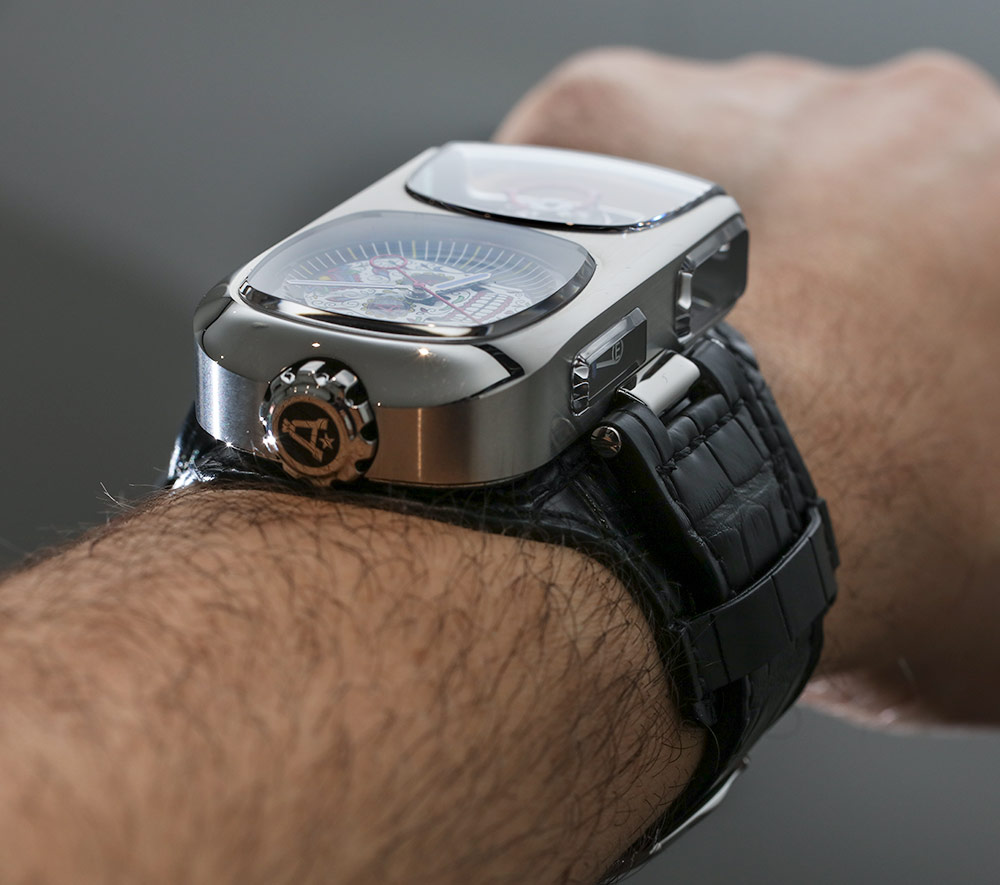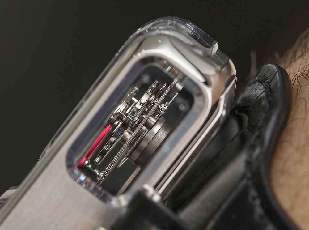 在手腕上,Angelus U10 Tourbillon Lumiere 在佩戴時總是比其笨拙的表殼形狀所暗示的更舒適。在全新的外灘款式表帶上,U10 Calavera 的佩戴更加出色。表殼寬 62.75 毫米,高 38 毫米。它也是 15mm 厚,防水深度為 30m。表殼周圍的所有藍寶石水晶有助于您看到表盤和機芯的重要部分。這包括側面安裝的動力儲存指示器——我一直認為它的執(zhí)行非常優(yōu)雅。