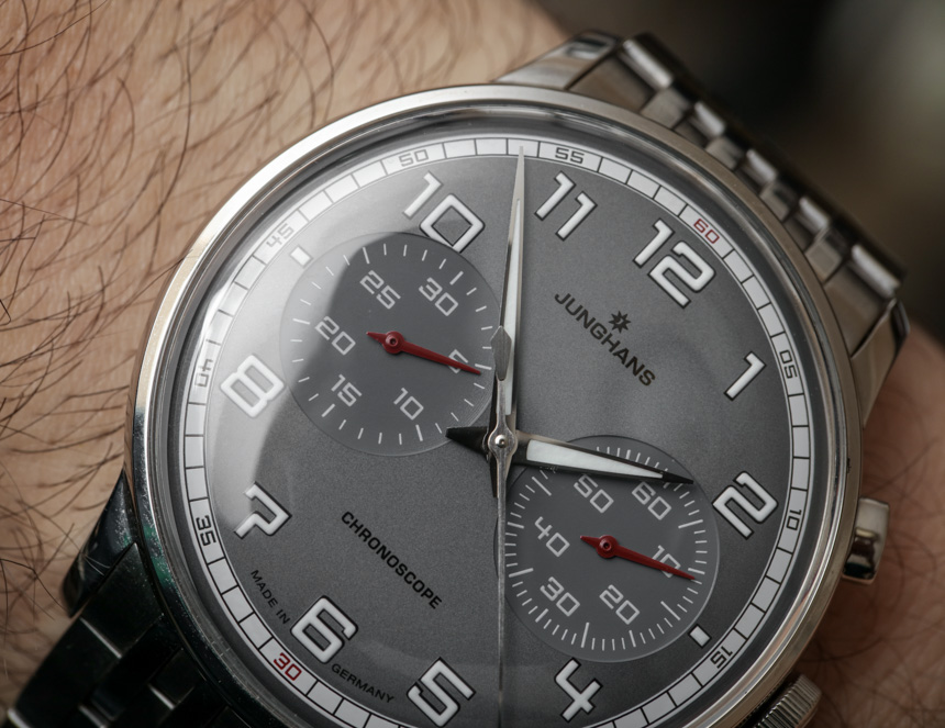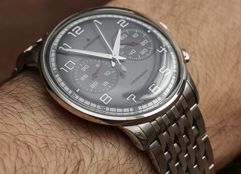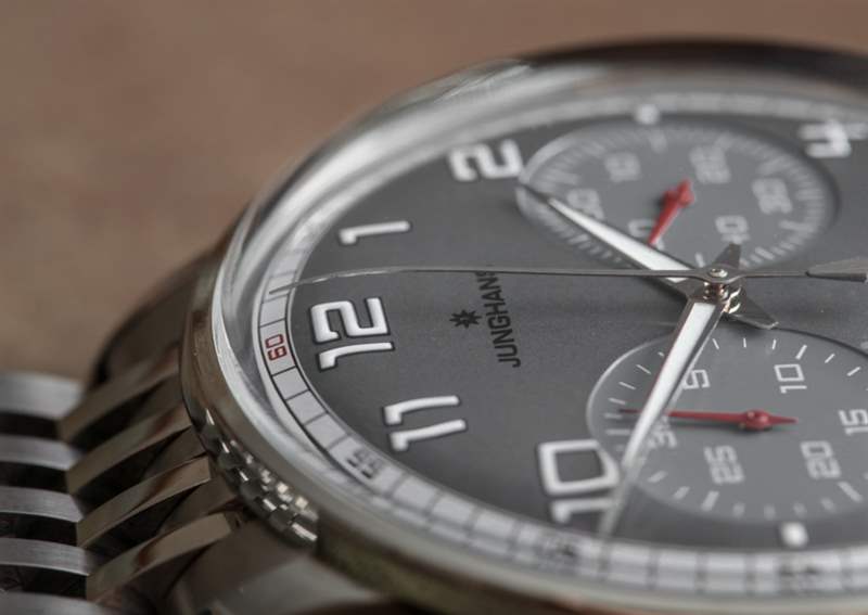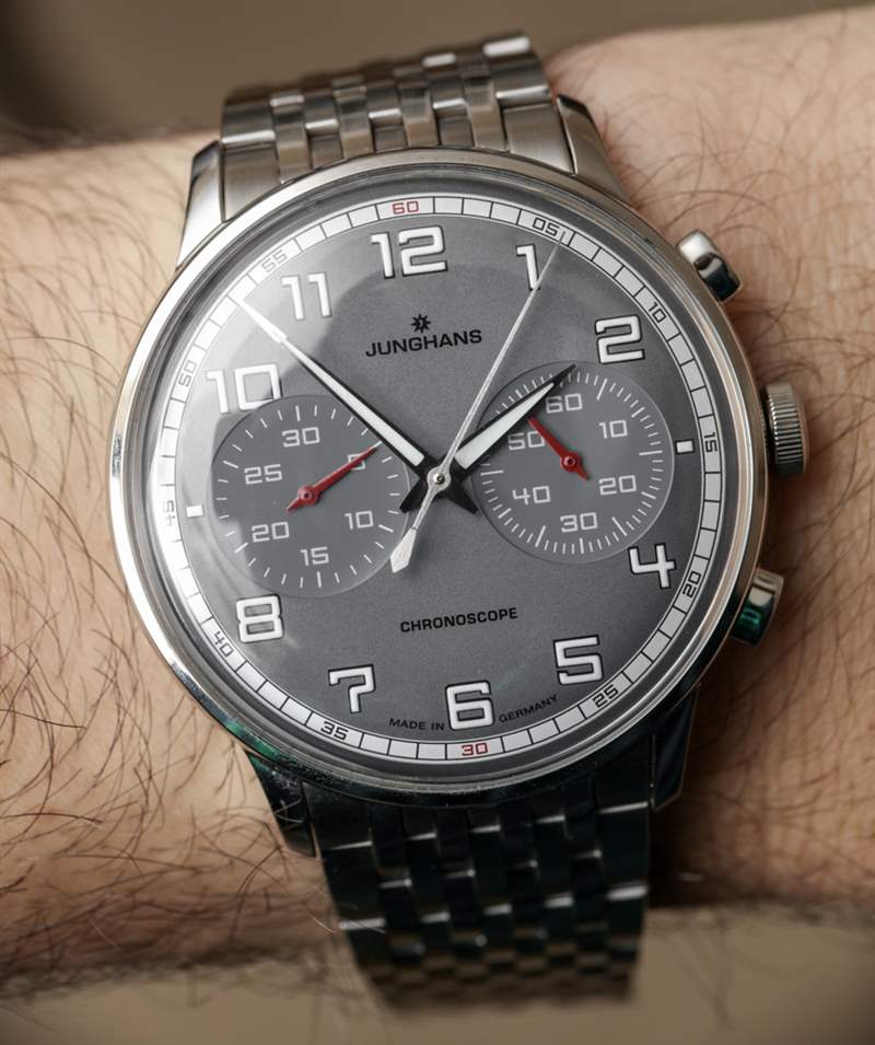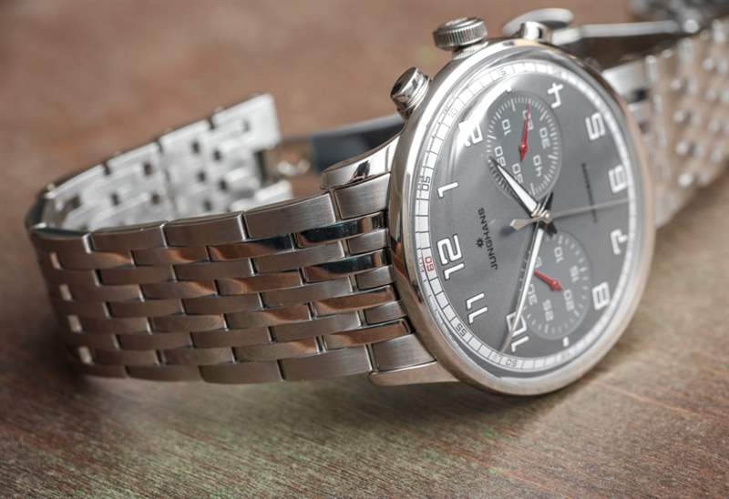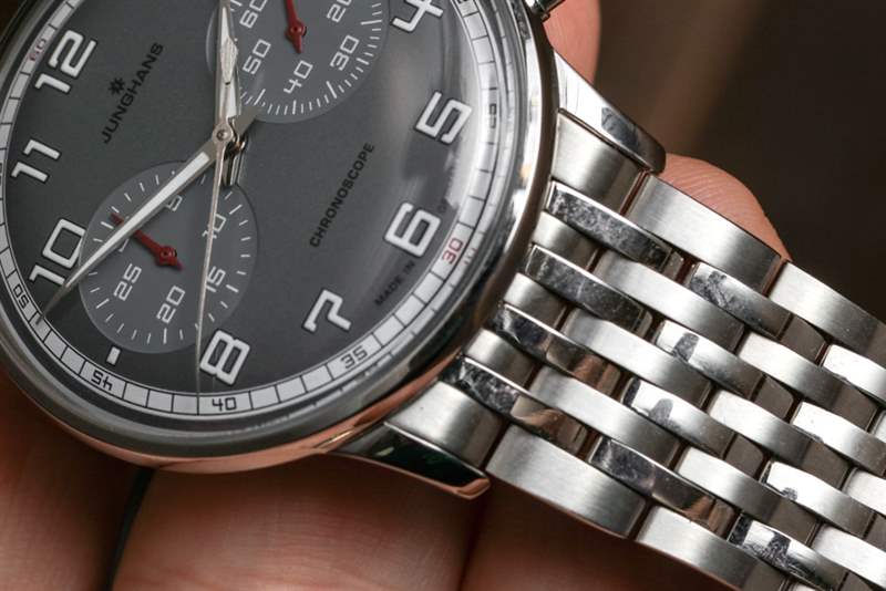 目前,Junghans 提供了幾個不同版本的 Meister Driver Chronoscope。這些面孔在圖片參考 027/3686.44 中提供灰色、深黑色/灰色以及雙色調“沙”米色。附在 Meister Driver Chronoscope 上的是一條合身的皮革表帶或這款漂亮的九鏈節鋼金屬表鏈。作為一個手鐲人,我當然選擇了那個選項。