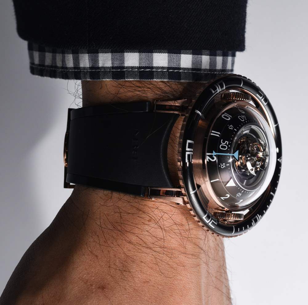 從側面看,MB&F HM7 Aquapod 看起來很像 1950 年代或 1960 年代的 UFO 概念,這直接體現了 MB&F 對科幻主題的持久熱愛與鐘表優雅相結合。盡管表殼相當大,寬 53.8 毫米,厚 21.3 毫米,但大部分重量實際上都位于您的手腕上方,因此非常舒適。此外,高端橡膠表帶非常舒適(而且看起來很整潔),并且可以舒適地佩戴在手腕上。在為 MB&F 之類的東西支付大筆費用時,您肯定知道自己在投資設計和人體工程學——認真。