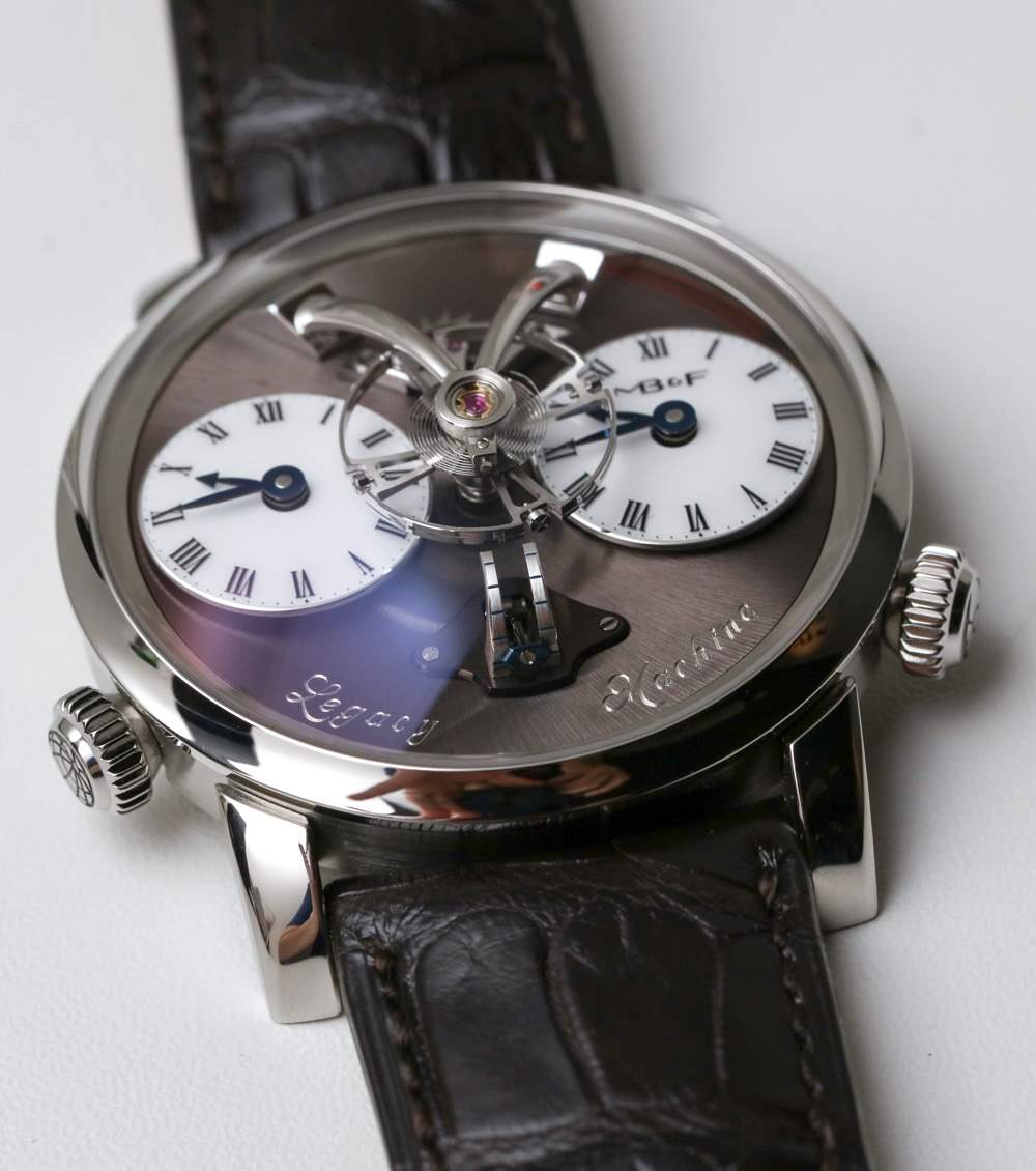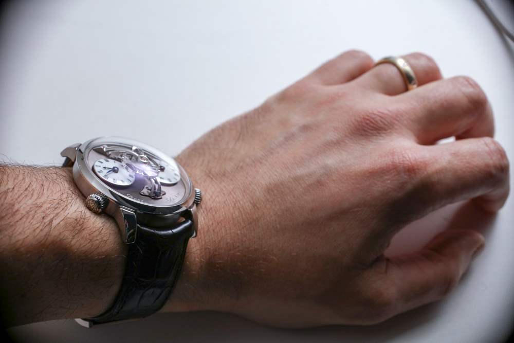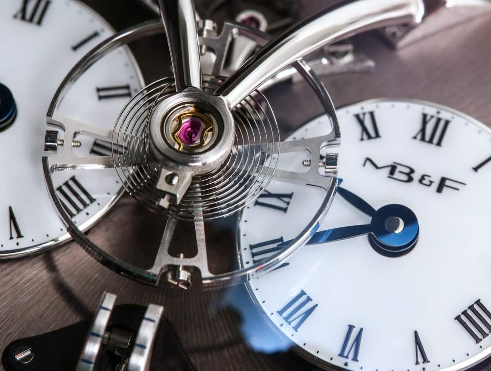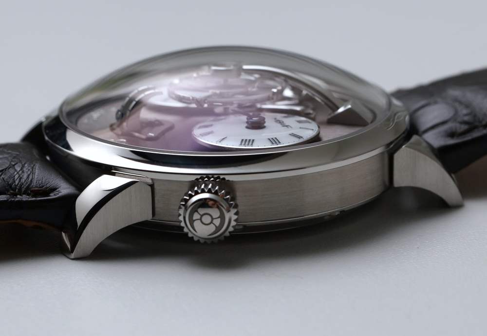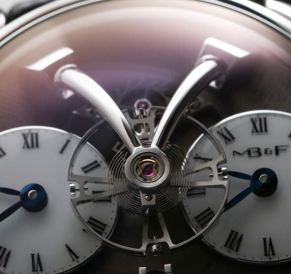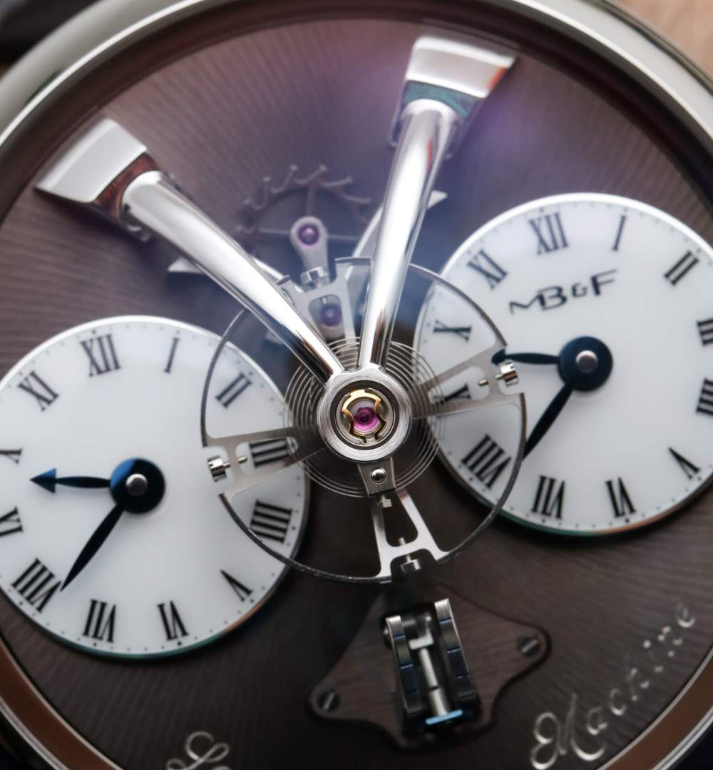 MB&F LM1 一直以來我最喜歡的功能之一是“垂直”線性動力儲備指示器。與表盤上的傳統指針不同,小臂作為動力儲存指示器在表盤上垂直上下移動。時間通過兩個表盤顯示。每個都或多或少是獨立的,可以根據您的喜好使用位于表殼兩側的兩個專用表冠之一設置為分鐘。它是一款非常方便的兩時區時計。