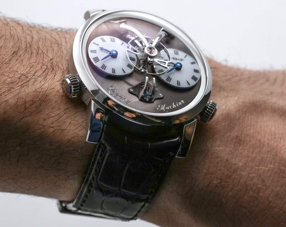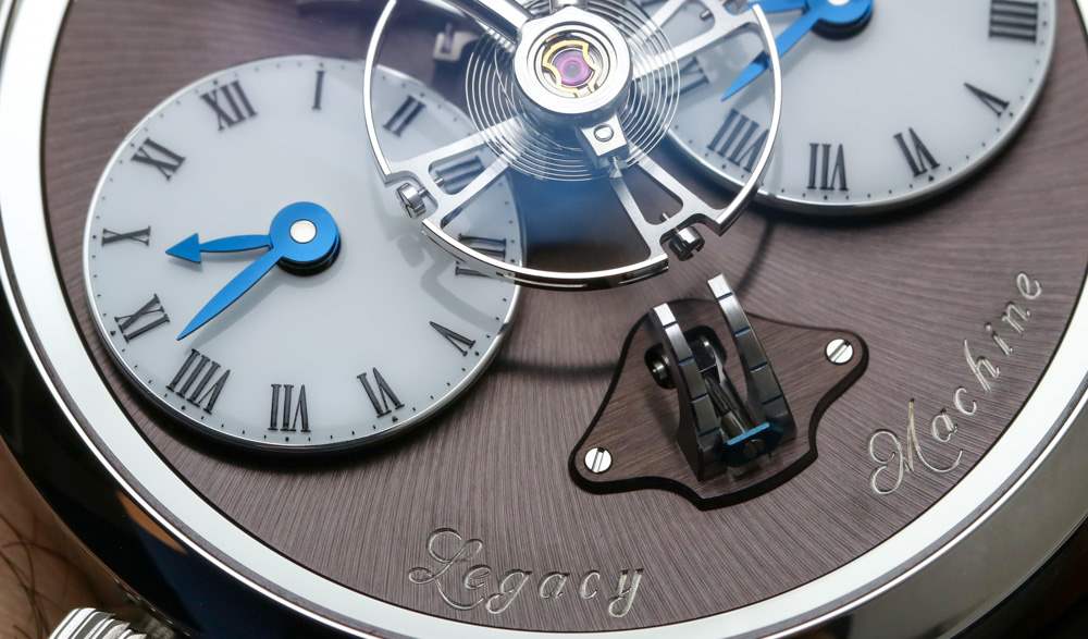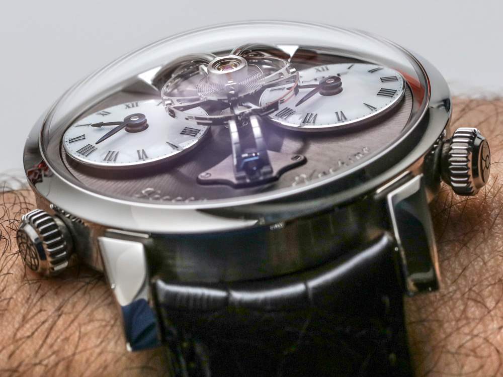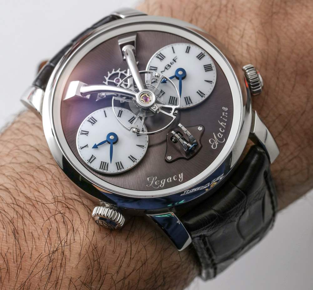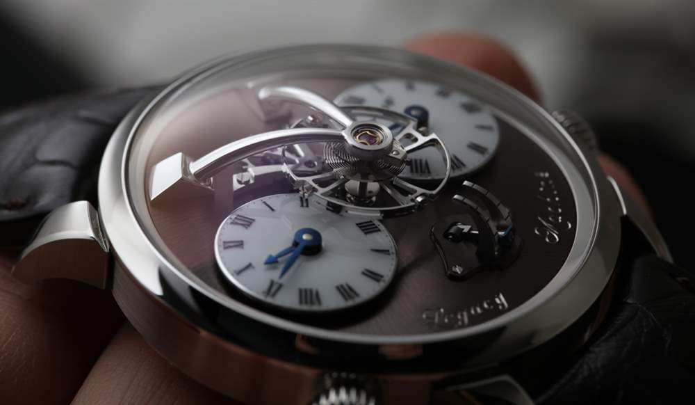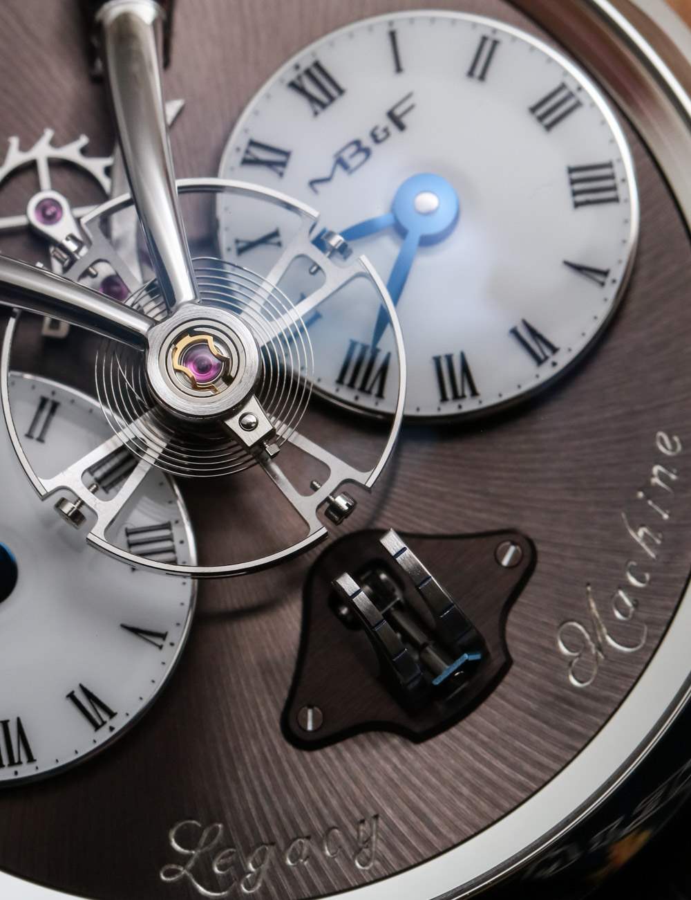 MB&F LM1 一直以來我最喜歡的功能之一是“垂直”線性動力儲備指示器。與表盤上的傳統指針不同,小臂作為動力儲存指示器在表盤上垂直上下移動。時間通過兩個表盤顯示。每個都或多或少是獨立的,可以根據您的喜好使用位于表殼兩側的兩個專用表冠之一設置為分鐘。它是一款非常方便的兩時區時計。