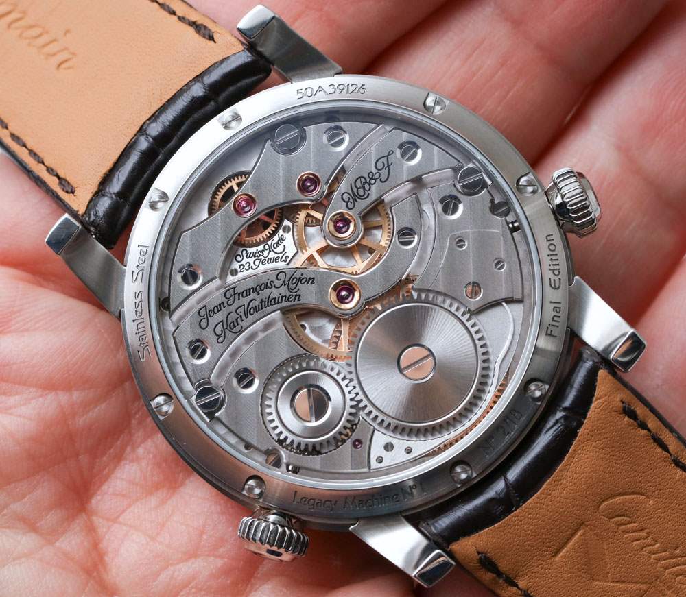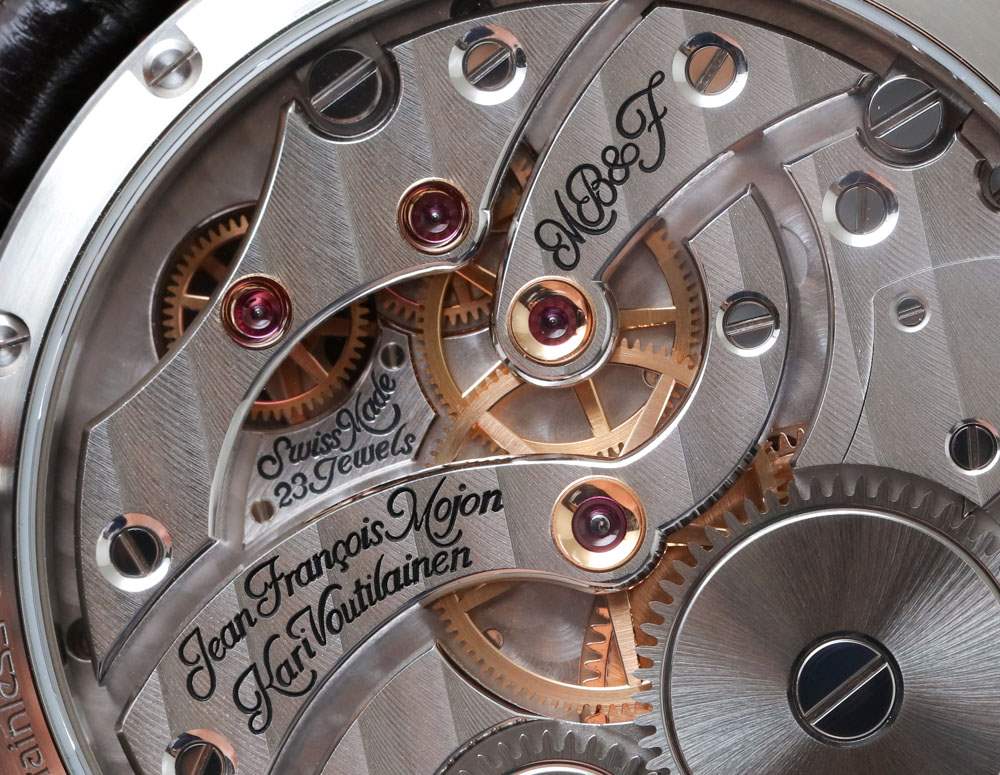 LM1 表殼再次為 44 毫米寬 x 16 毫米厚(由于顯著的圓頂藍寶石水晶)。它佩戴起來非常舒適,并包含專為 MB&F 生產的極其性感的手動上鏈機械機芯。該機芯在 Kari Voutilainen 的工作室完成,最初由 Jean-Francois Mojon 設計。該機芯由 279 個零件制成,運行頻率為 2.5Hz(18,000bph),動力儲存為 45 小時。相對較慢的擺輪頻率是故意的,以便用戶可以通過表盤更好地查看調節機構的動畫,因為擺輪突出顯示在面部的橋上。