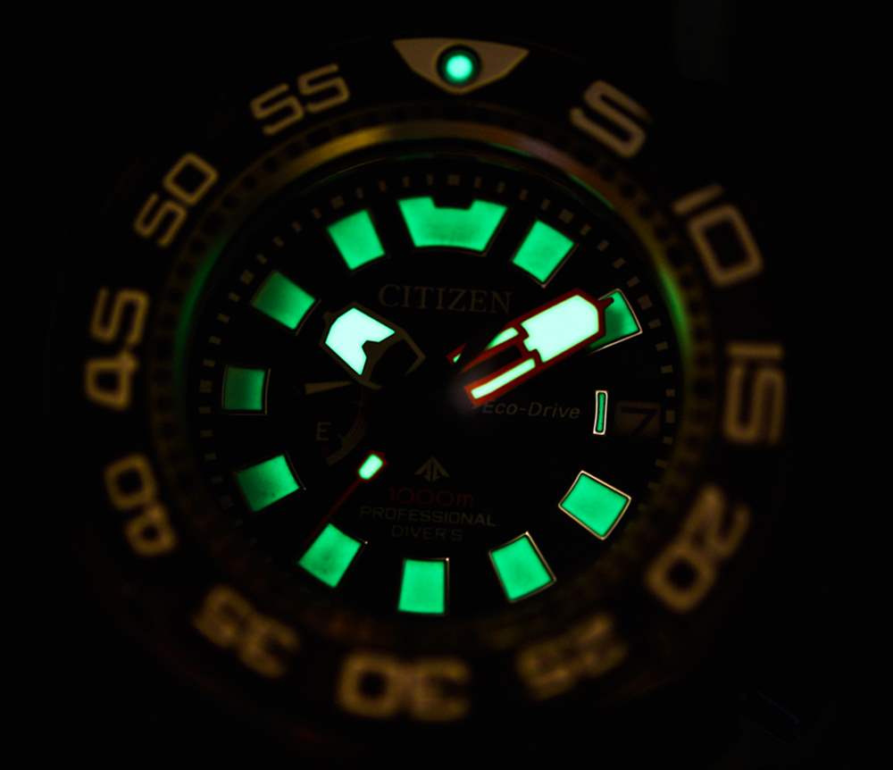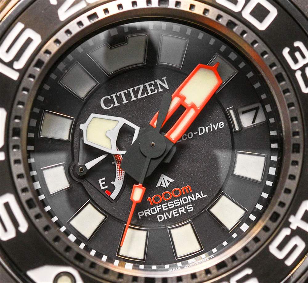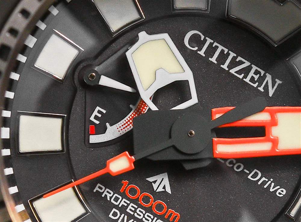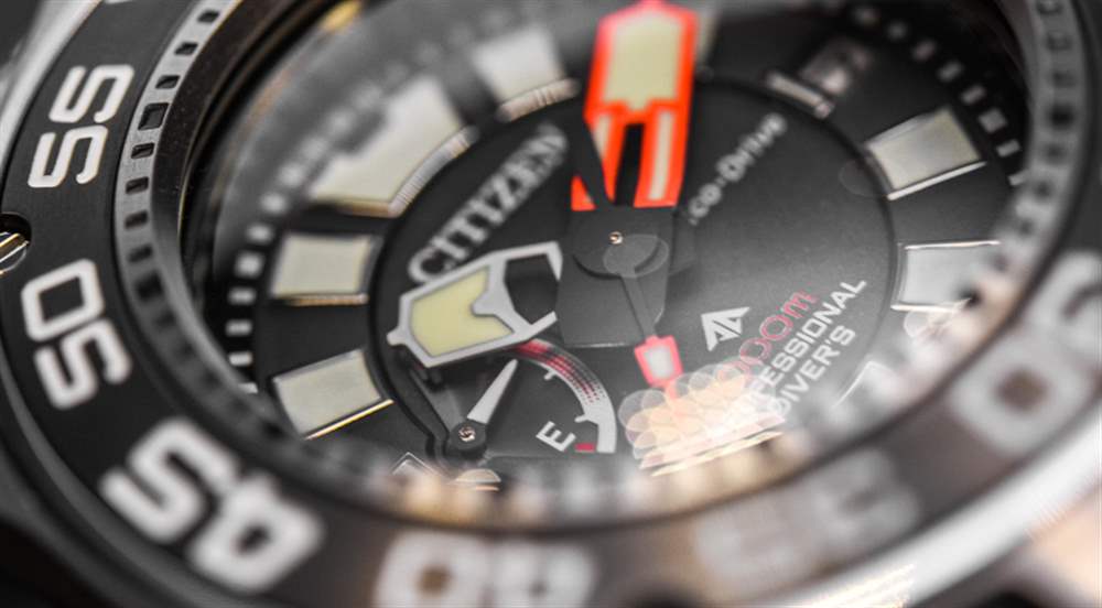 雖然不是西鐵城的新功能,但我想指出,西鐵城 Promaster Professional Diver 1000m 在表盤上包括一個(gè)動(dòng)力儲(chǔ)存指示器。由于這不是機(jī)械表,因此它不會(huì)顯示主發(fā)條中剩余的電量,而是顯示可充電電池中剩余的充電時(shí)間。光動(dòng)能手表可以使用幾個(gè)月而不需要充電(事實(shí)上,手表內(nèi)部的西鐵城 J210 光動(dòng)能石英機(jī)芯充滿電可以使用 2.5 年),但如果您即將進(jìn)行潛水并需要要依靠您的手表,確保它有足夠的電池電量非常重要。最重要的是,如果你沒(méi)有足夠的果汁,你可以簡(jiǎn)單地將手表放在陽(yáng)光下幾個(gè)小時(shí),你會(huì)很高興的。