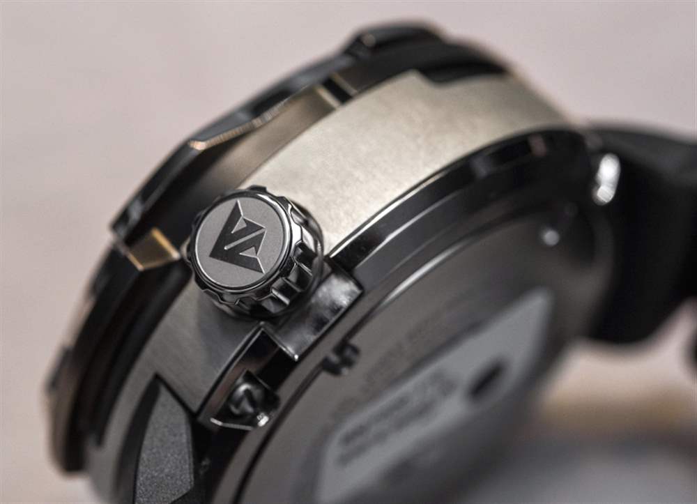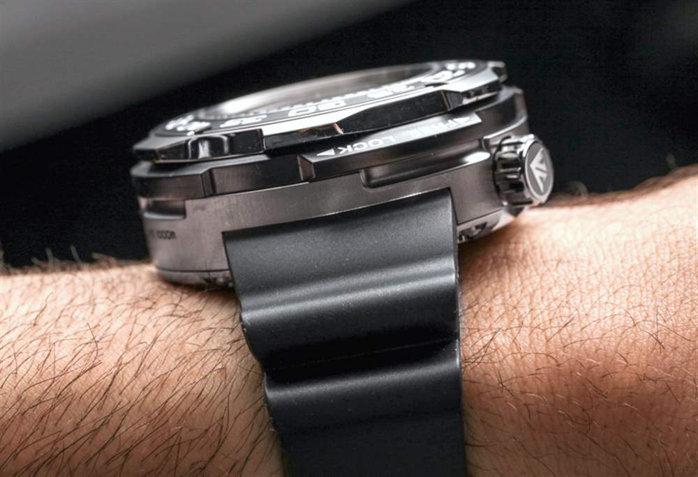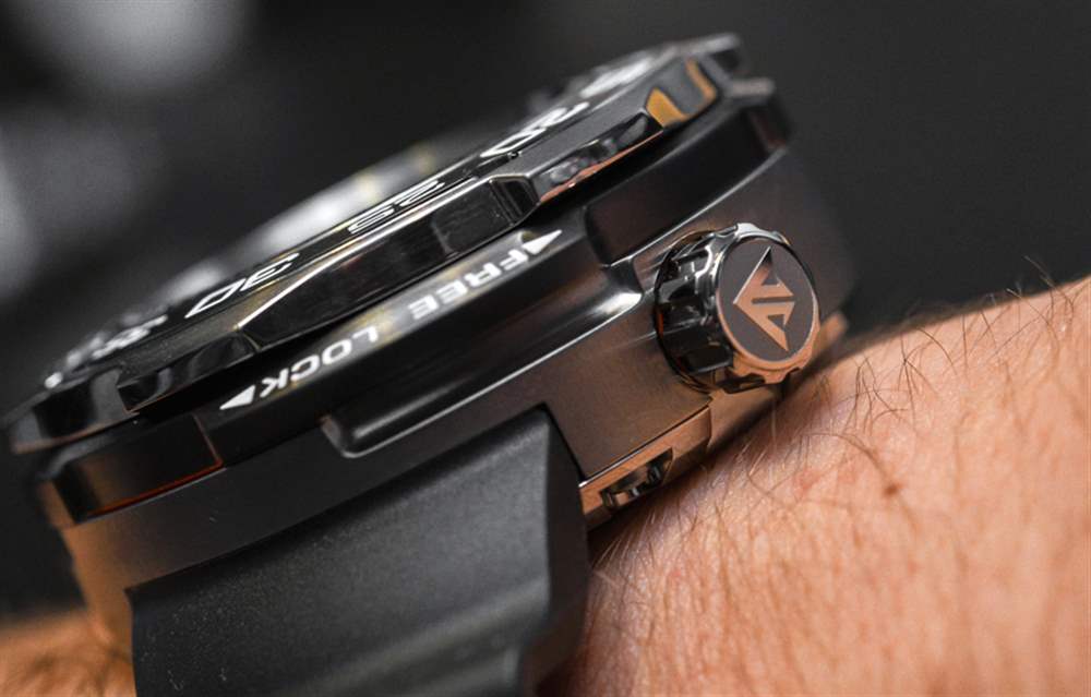 在手腕上,手表看起來(lái)像一堆圓鋸片,表盤清晰可見(jiàn),當(dāng)然上面是藍(lán)寶石水晶。肥大的指針幾乎完全占據(jù)了表盤,這種方式幾乎令人討厭,以至于很有趣。發(fā)光體的體積很大,如果我要審查其中一個(gè),我迫不及待地想在黑暗中玩它。這款手表寬 52.5 毫米,厚 21.4 毫米,并不精致——它有一條厚實(shí)的橡膠式黑色聚氨酯潛水表帶,以匹配它的重量。話雖如此,無(wú)耳式表殼和整體設(shè)計(jì)使其完全可以戴在像我這樣更小的手腕上。是的,這是一款適合您想要玩耍和/或讓人們注意您的手腕的時(shí)候的時(shí)計(jì)……除了潛水,就是這樣。