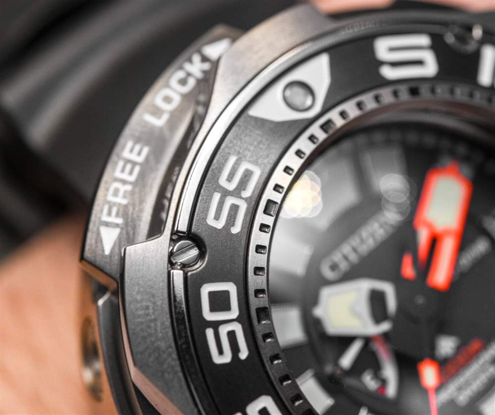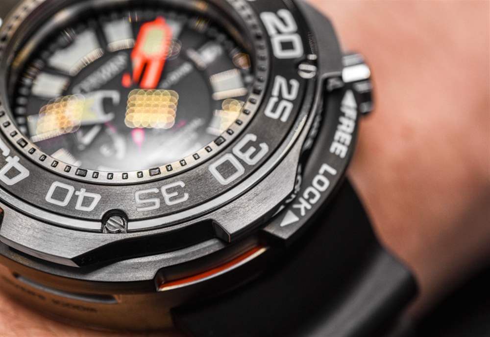 西鐵城的“超級(jí)鈦”具有鈦的重量輕和強(qiáng)度低的優(yōu)點(diǎn),并具有使表面更硬且耐刮擦的處理的附加優(yōu)點(diǎn)。同樣,當(dāng)他們的新手表開始出現(xiàn)磨損跡象時(shí),沒(méi)有人會(huì)喜歡它。對(duì)于 Citizen Eco-Drive Promaster Professional Diver 1000m,西鐵城開發(fā)了一種新的表圈鎖定系統(tǒng),它是一個(gè)可以鎖定表圈旋轉(zhuǎn)的環(huán)。對(duì)于專業(yè)潛水員來(lái)說(shuō),這顯然是一個(gè)有用的功能,而且我還沒(méi)有見(jiàn)過(guò)像這樣的系統(tǒng)。對(duì)于桌面潛水員來(lái)說(shuō),這只是意味著可以玩一些新的東西。這款特別的西鐵城潛水表的質(zhì)量和工藝比我多年前的第一塊西鐵城 Promaster 手表要高出許多世界。
