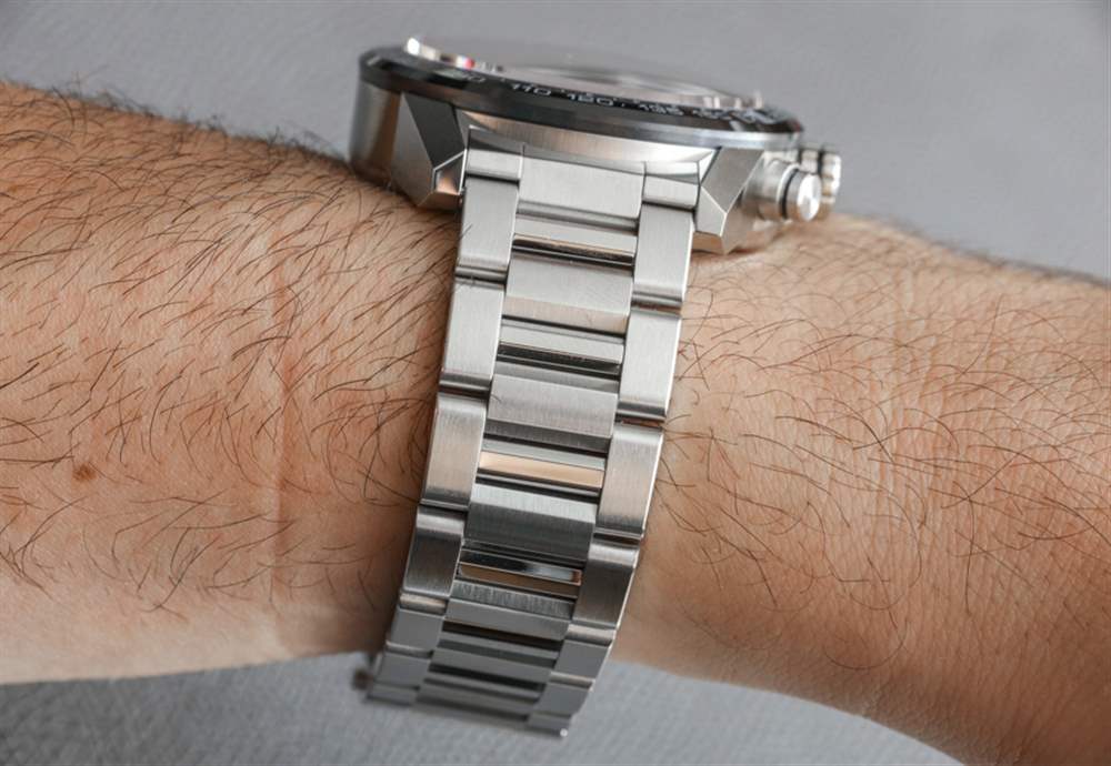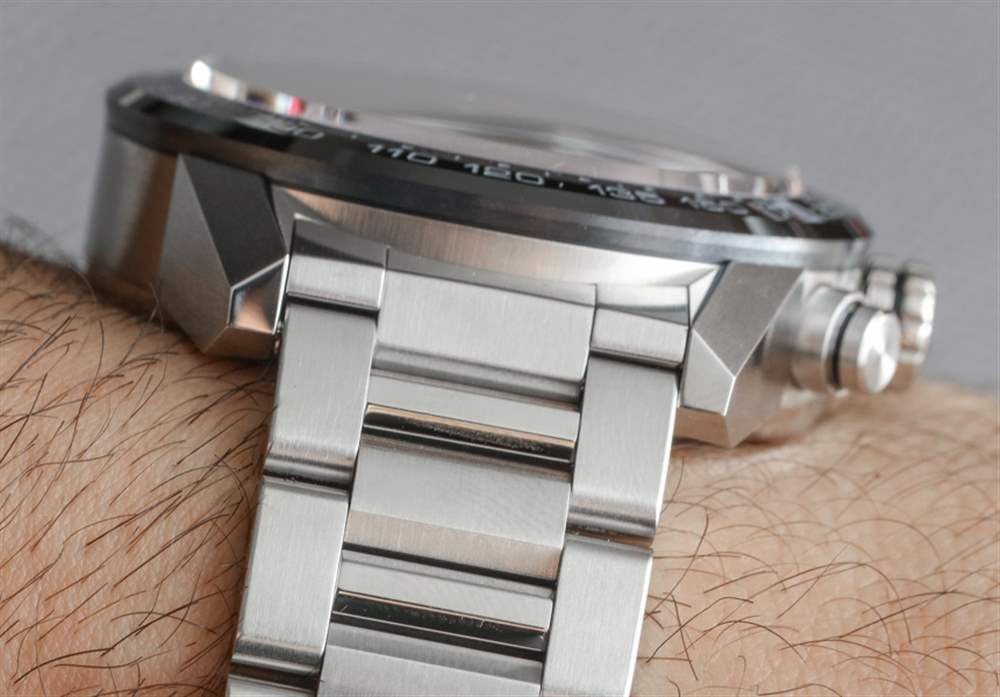 直接看手表時,與略顯柔和的 1887 相比,Heuer 01 版本的 Carrera 在線條上更加棱角分明,更具侵略性。這有點像將蘭博基尼的美學與法拉利進行比較。需要指出的是,TAG Heuer Carrera 1887的表鏈實際上比Carrera Heuer 01的表帶寬了一點,只是稍微改變了美學。話雖如此,這兩款手表都具有三鏈式拉絲和拋光精鋼表鏈,折疊式展開式表扣在設計上非常相似。但同樣,所有部分都是獨一無二的。