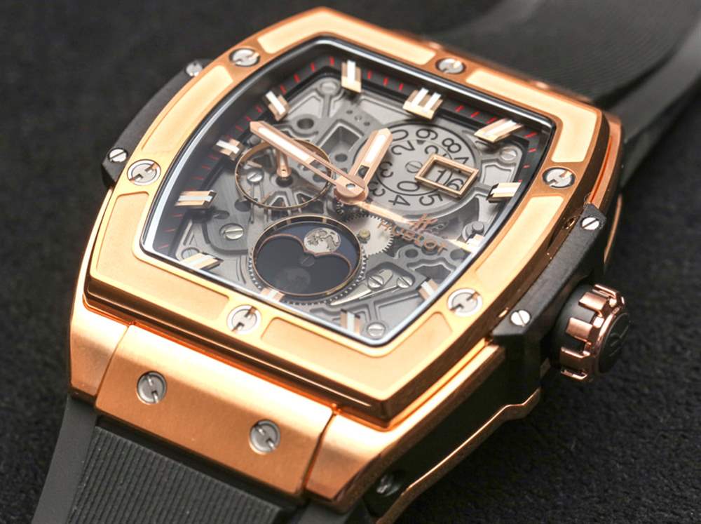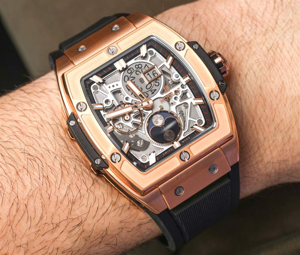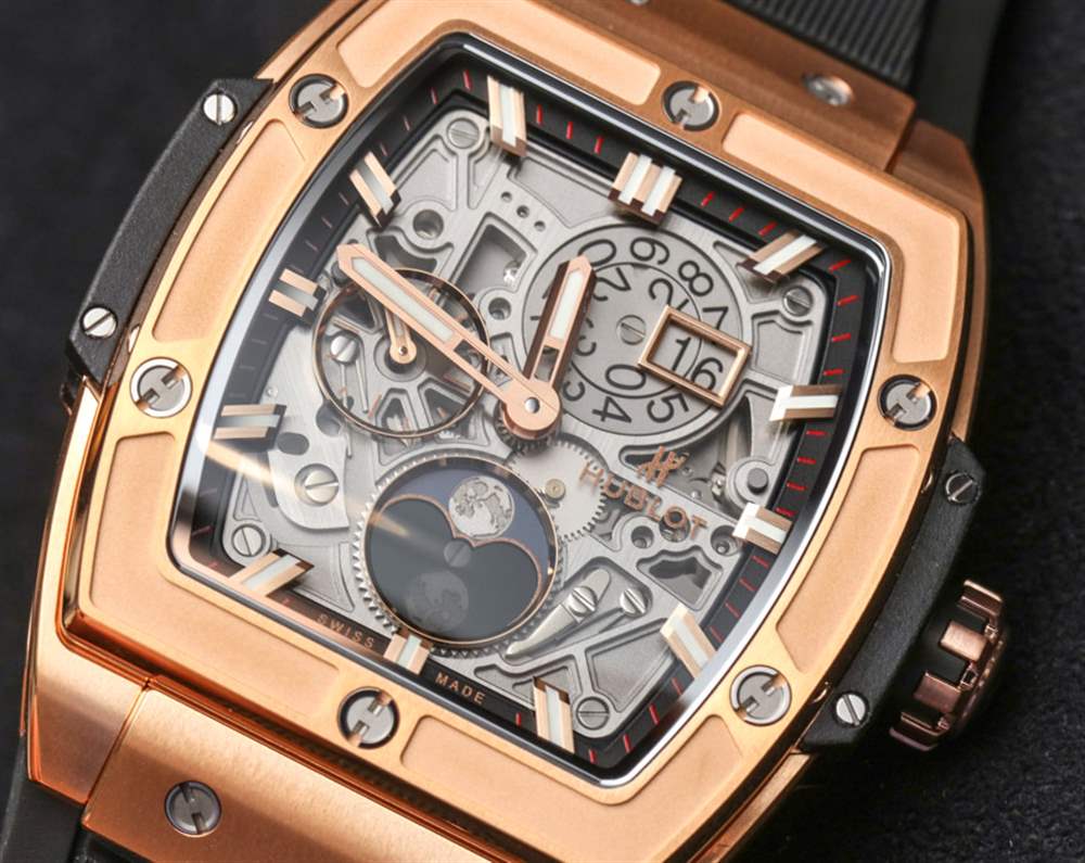 最初的 Hublot Spirit Of Big Bang 采用 45 毫米寬的表殼,考慮到酒桶形表殼的長尺寸,對于大多數(shù)手腕來說都相當大。Hublot Spirit Of Big Bang Moonphase 特別系列首次亮相更小、更耐磨的 42 毫米寬酒桶形表殼(防水深度達 100 米)。目前,這些較新的 Big Bang 精神月相腕表有兩種版本,一種為鈦金屬,另一種為 18K 王金(基本上是紅金)。