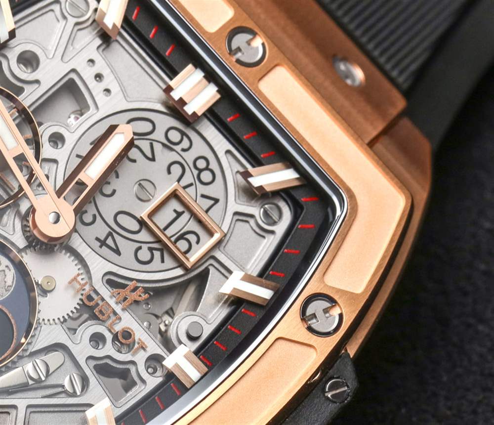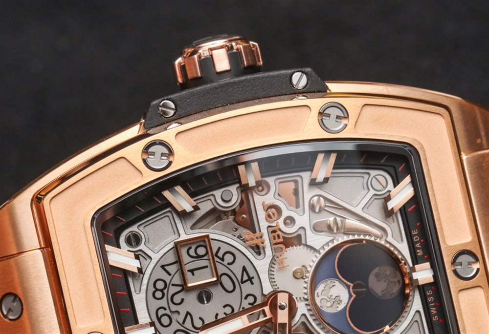 我很喜歡 Big Bang 風格的拉絲指針,它提供了不錯的易讀性,尤其是在 King Gold 版本中,這要歸功于增加的對比度。我不是鏤空日期顯示的忠實粉絲,但這個還不錯。盡管表盤本質(zhì)上是不對稱的,但我確實覺得各種元素在很大程度上是相當平衡的。然后你有超過 6 點鐘的月相指示器窗口,它以自己的方式被鏤空,因為半透明的圓盤用來隱藏圓盤的“不可見”部分。