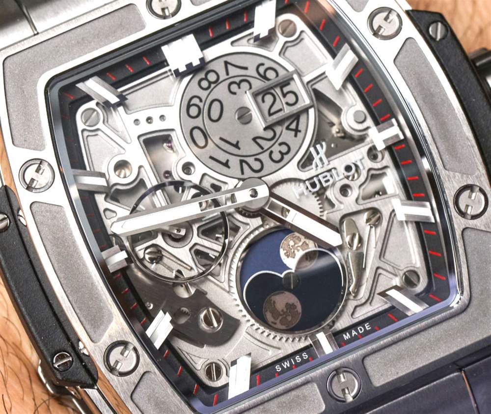 表盤周圍是小時和分鐘刻度,這是一種受歡迎的觸感,實際上也相當經(jīng)典——盡管體現(xiàn)了宇舶的現(xiàn)代美學。事實上,我認為思考 Big Bang 月相精神的一個好方法是作為另一個“混合”概念,宇舶試圖將更傳統(tǒng)的東西(復雜功能)與更現(xiàn)代的東西(整體表盤和表殼)結合起來。設計)。你認為它在這方面是成功的嗎?