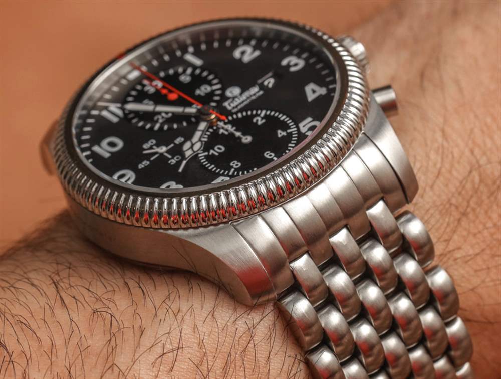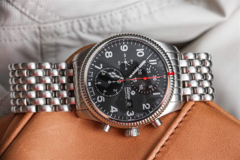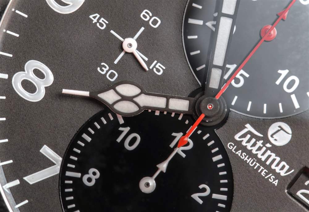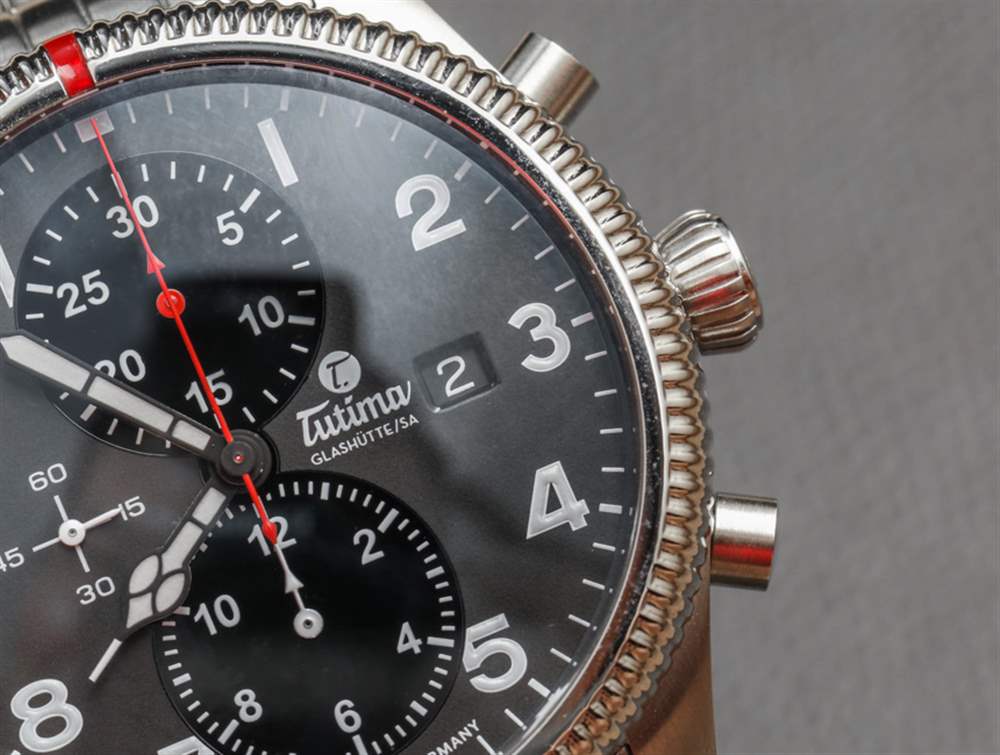 紅色的強調(diào)色也是一個重要的風(fēng)格提示,謝天謝地,這種顏色的使用相當(dāng)謹(jǐn)慎。計時碼表秒針和分針表盤使用紅色,但計時碼表時針不使用紅色。我相信這是有充分理由的,但通常在顏色編碼指針方面,時間指針是一種顏色,而計時指針是另一種顏色。因此,雖然 Tutima 渲染 Tutima Grand Flieger Classic Chronograph 表盤的方式在美學(xué)上看起來更好,但我的強迫癥告訴我計時碼表時針也應(yīng)該是紅色的。