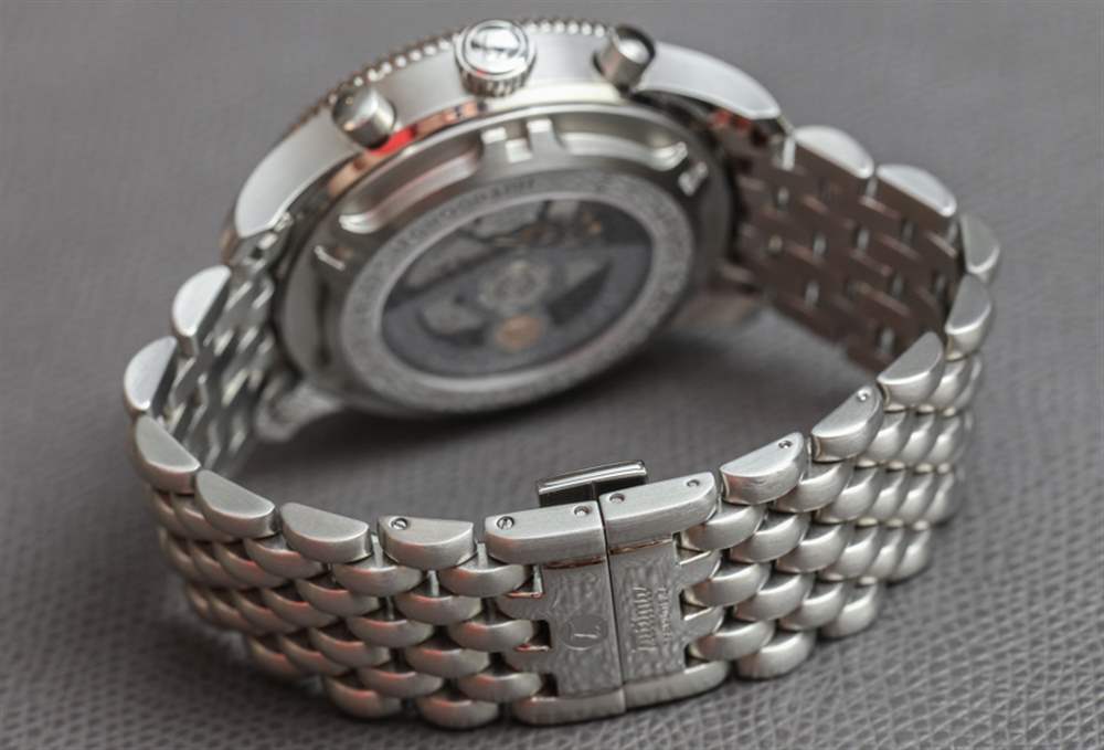紅色進一步用于雙向旋轉(zhuǎn)硬幣邊緣表圈上的“0標(biāo)記”。Tutima 延續(xù)了制作這種有點過時風(fēng)格的旋轉(zhuǎn)表圈的傳統(tǒng)。我說的是陳舊的,因為它們只有一個參考點(紅色標(biāo)記),因此理論上不如旋轉(zhuǎn)表圈有用,例如,具有更多標(biāo)記的潛水式手表。擋板具有令人愉悅的流暢操作。我不認(rèn)為很多人會使用它,但它是一個很好的附加功能。