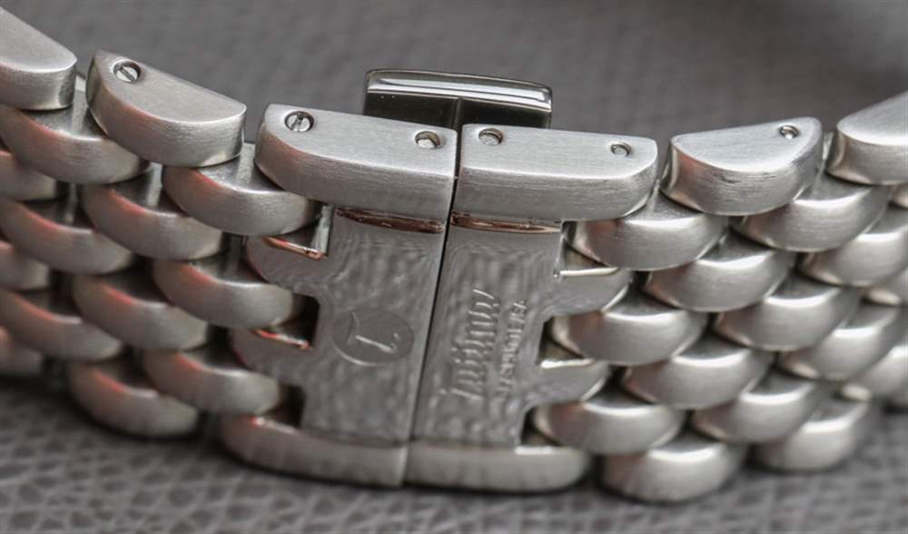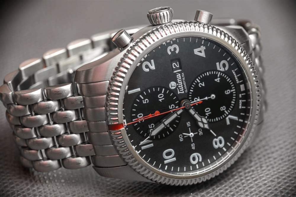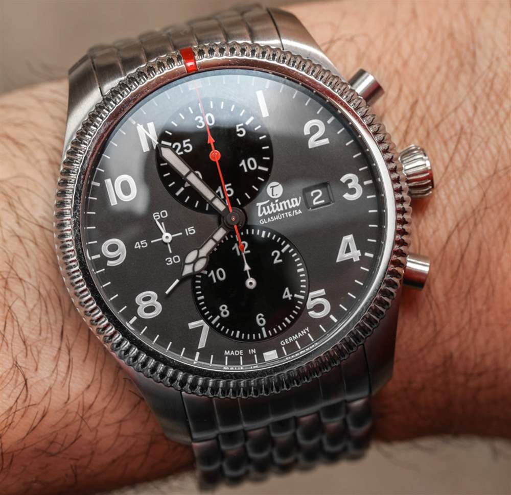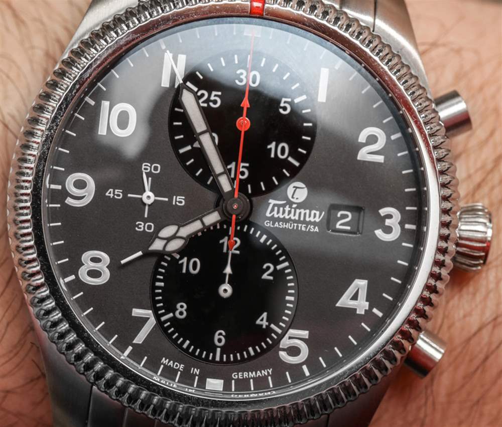 整體表盤設(shè)計是經(jīng)典的,但與標(biāo)準(zhǔn)的偏差剛好足以被認(rèn)為是不同的。正如我所說,Tutima 盡職盡責(zé)地使用了熟悉的指針和時標(biāo)等傳統(tǒng)元素,以及手表的整體核心外觀。但與時標(biāo)重疊的對比鮮明的小表盤是一種更現(xiàn)代的設(shè)計元素。另請注意,與其他現(xiàn)代 Tutima 手表(例如此處評測的 Tutima M2)類似,運行秒子表盤很小且不那么強調(diào)。這創(chuàng)造了兩個小表盤計時手表的外觀(它本身比三個小表盤更經(jīng)典)。表盤還有一個相對不會讓人分心的日期窗口,它配有一個與表盤相匹配的深色圓盤。