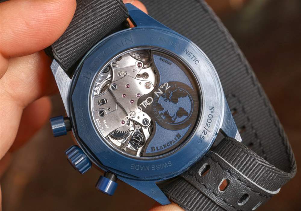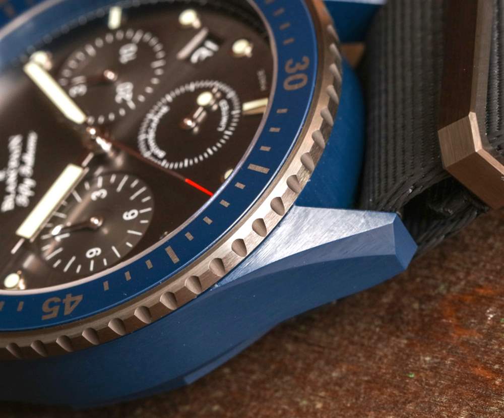 第一款五十噚深海飛返計時海洋承諾腕表采用灰色陶瓷表殼,搭配藍(lán)色表圈和表盤。寶珀五十噚深海飛返計時碼表 Ocean Commitment II 采用藍(lán)色陶瓷表殼和表圈,然后是金屬灰色表盤,有點顛倒了這個調(diào)色板。第一款和第二款 Ocean Commitment 都非常棒,但陶瓷手表愛好者顯然會涌向這款續(xù)集限量版。