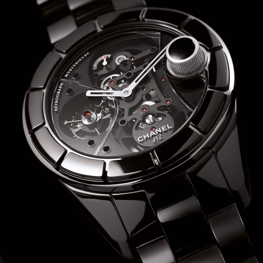 香奈兒與 APRP 有著長期的合作關系。后者代表Audemars Piguet、Renaud & Papi,致力于設計和生產非常復雜的異國機械機芯。2010年,香奈兒發布了一款非常奇特的高端男士腕表,名為Chanel J12 Rétrograde Mystérieuse Tourbillon。它基于流行的 J12 系列,主要是黑色或白色陶瓷表殼,在 2000 年代初開始流行。J12 因采用復古運動手表設計并將其渲染為現代材料(陶瓷)而廣受歡迎。