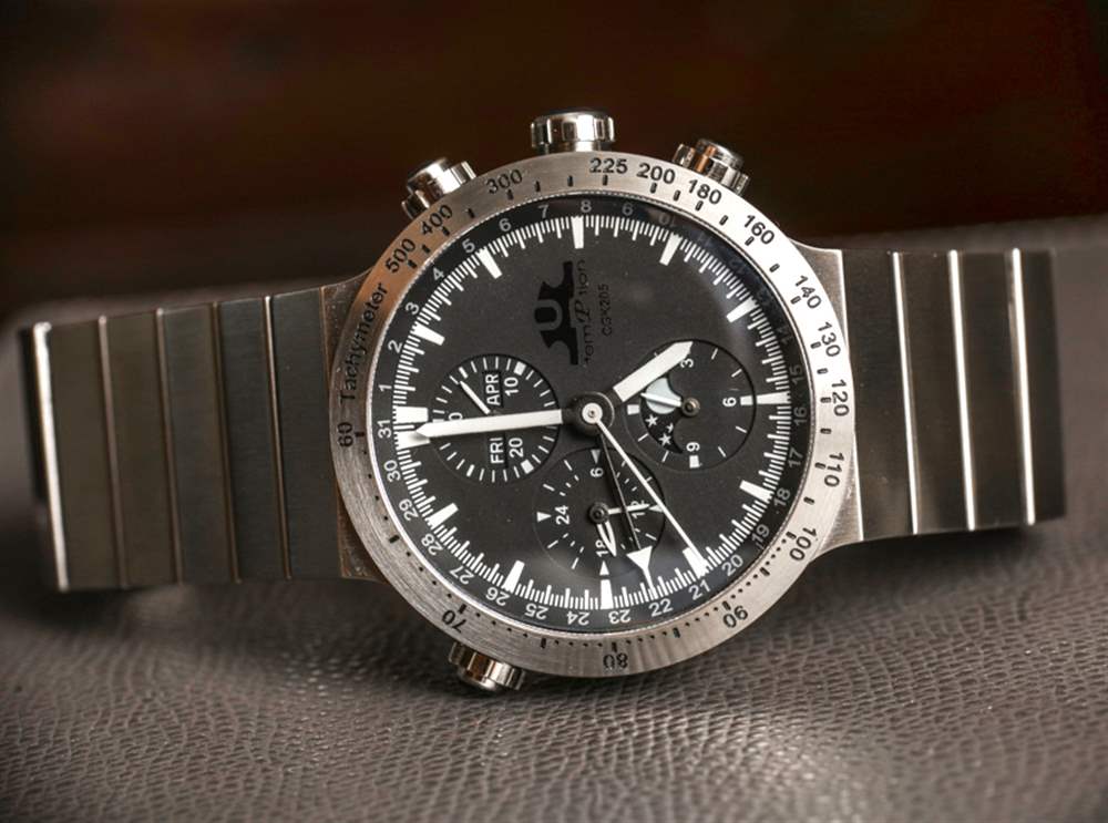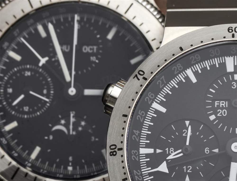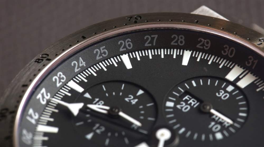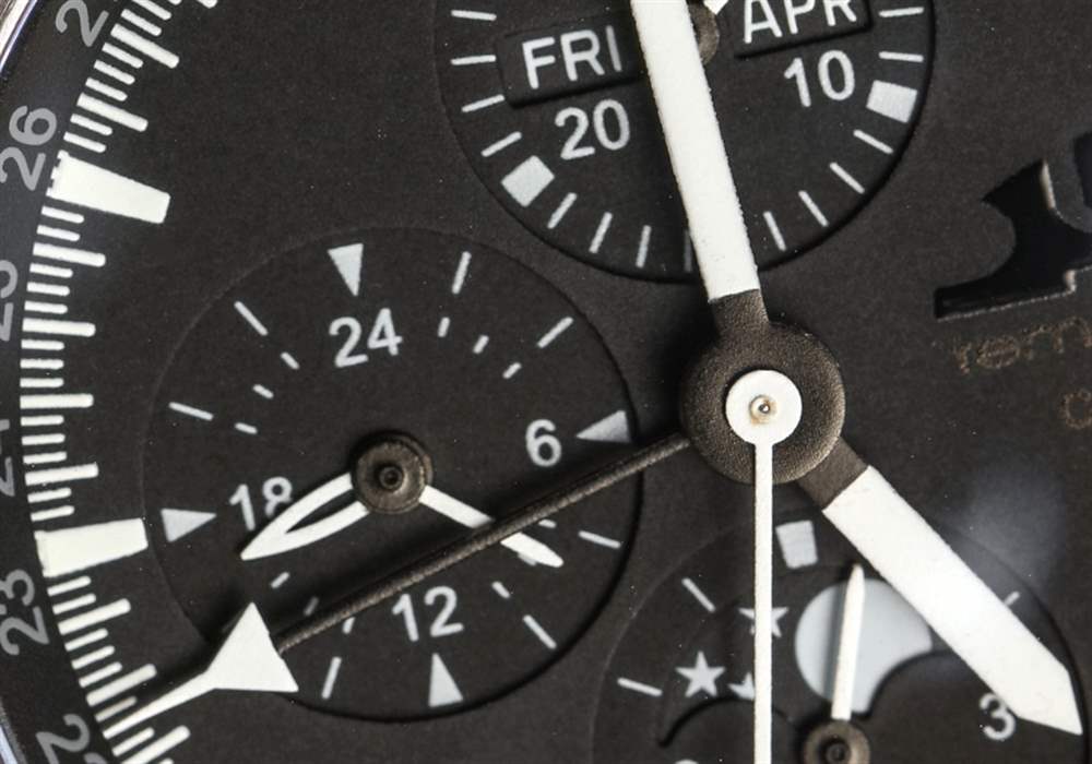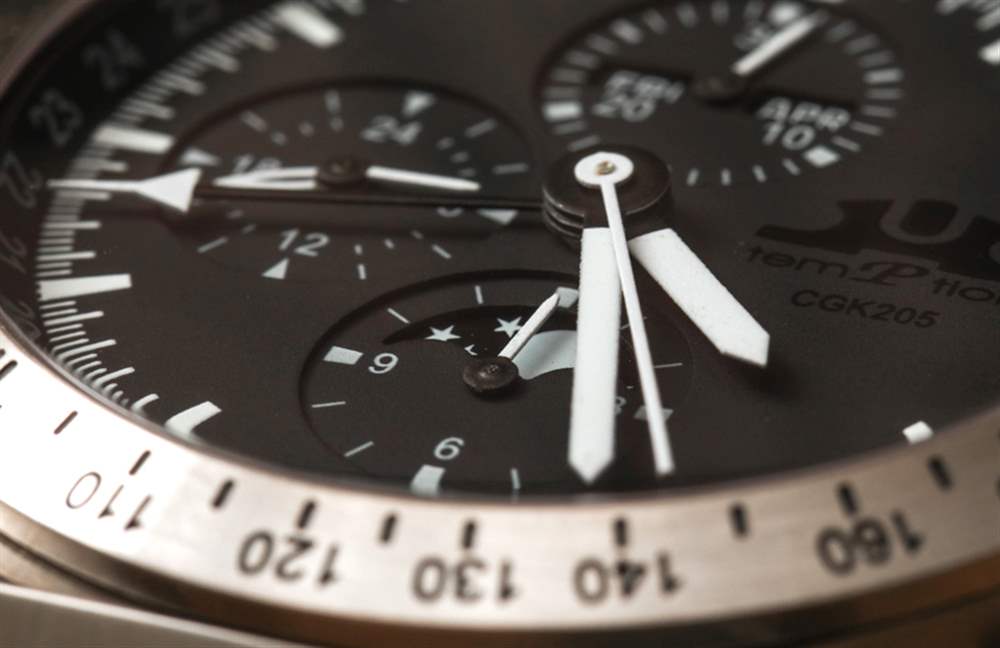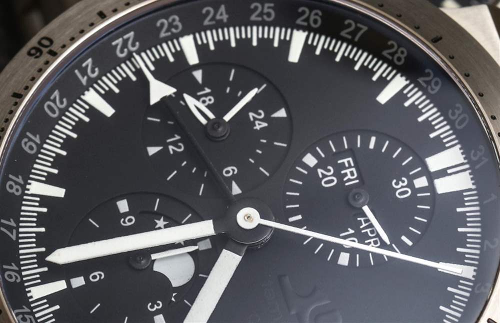 Valjoux 7751 自動機芯本質上是 7750,但增加了一些額外的復雜性。基礎機芯帶有 12 小時計時碼表,7751 型號增加了一個完整的日歷,帶有星期和月份窗口以及日期指針、帶 AM/PM 指示器的同步 24 小時指針和一個月相指示器。雖然完整的日歷不像年歷或萬年歷那么花哨,但使用表冠和 10 點鐘位置的旋入式按鈕,可以在需要時相對輕松地調整日歷數據。