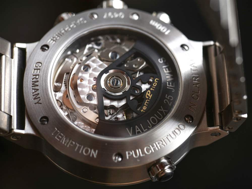在評論視頻中,您可以看到我將 Temption CGK203 與此 CGK205 進行了比較。主題和機芯是相同的,但在表殼、表盤、水晶和表鏈方面,它們是不同的手表。手表內部是瑞士ETA Valjoux 7751自動計時機芯。這種不太受歡迎的機芯功能齊全,但很難設計表盤。話雖如此,它的功能也很合理。Temption 還碰巧提供了 7751 的完整裝飾版本,其中包括許多漂亮的珍珠拋光和藍鋼螺絲。