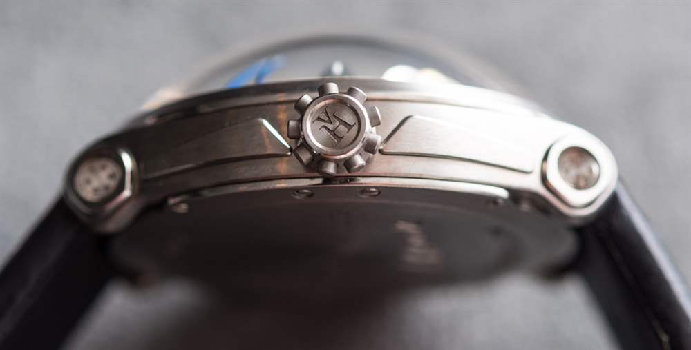 手表的核心是高度可見的三軸陀飛輪,它在表盤中間向不同方向跳舞。有兩個獨特的藍色指針環繞表盤指示小時和分鐘。如果你仔細看,你會發現分針每分鐘跳一個位置——這很酷。