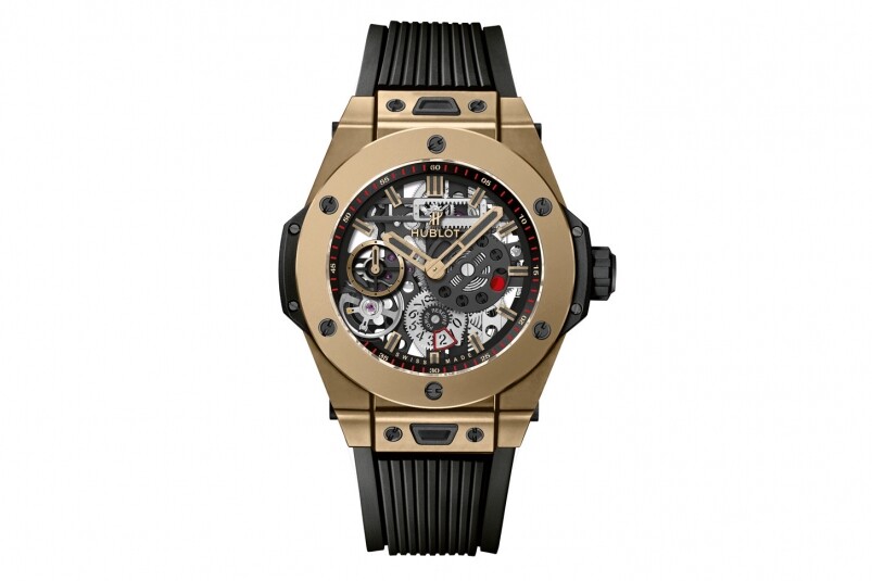 運動型腕表多是賣靚樣,夠搶眼硬凈已經(jīng)夠高分,難得Hublot這枚也有內(nèi)涵,足足提供10天動存,以sports watch來說屬罕見了。45mm表殼用上品牌獨家調(diào)制的Magic Gold,它是世上最堅硬的黃金,比一般黃金更有效防刮,色澤亦深沉一點,感覺低調(diào)而不落俗套。表盤用上鏤空結(jié)構(gòu),機芯運作一覽無遺,6時位置更設(shè)有一個數(shù)字轉(zhuǎn)盤,顯示動力儲備日數(shù)。