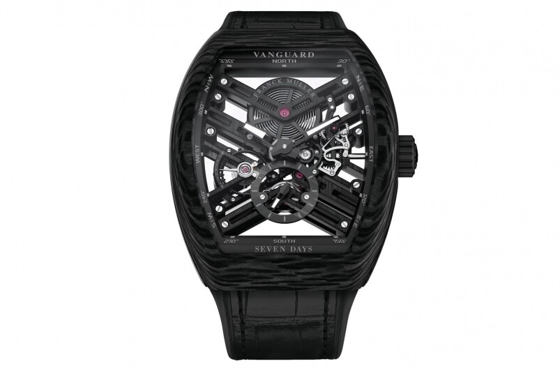 酒桶形表殼一向是Franck Muller的招牌設(shè)計,這枚Vanguard特別用上碳纖維表殼,獨特紋理布滿表殼表面,正下方寫有「SEVEN DAYS」,明刀明槍告訴大家它有7日鏈。最搶鏡的自然是鏤通得非常徹底的表盤,用家可一邊欣賞表橋的建筑幾何美感,一邊感受機械機芯的心跳。