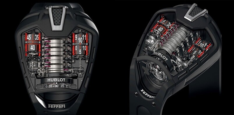 至于世上最長動能的機械腕表,非2013年面世的Hublot MP-05 LaFerrari莫屬,品牌史無前例地將11個發(fā)條鼓一脈相連,提煉出馬拉松式的50日動存。腕表的外形設(shè)計已經(jīng)先聲奪人,上鏈方法同樣出位,就是用Hublot 特制的迷你電鉆為機芯「上膛」,相當(dāng)架勢!