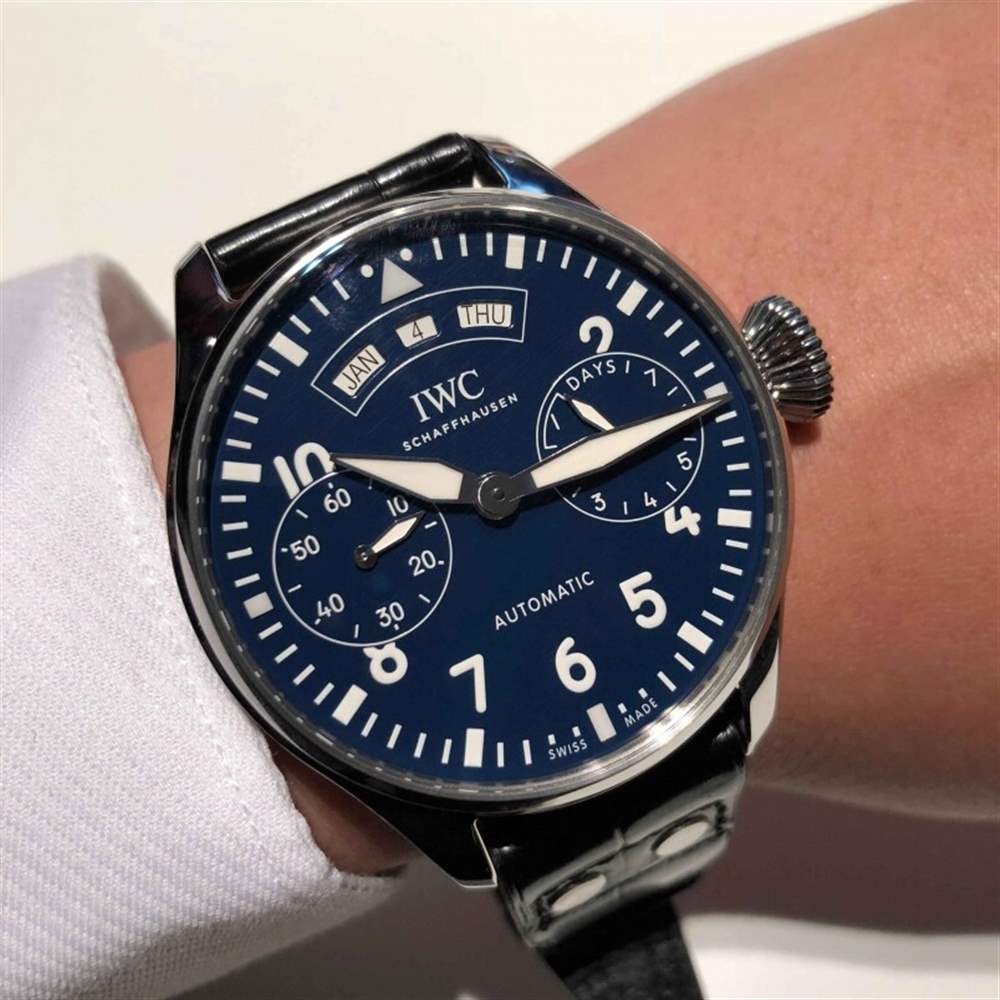 IWC Big Pilot’s Annual Calendar(IW502708) 是IWC整個150周年系列之中,唯一一款年歷款式,年歷的特別之處,是可以一整年只需調整一次日期,就是在二月的時候,在其余的月份都可以自動調節30日或是31日。其藍色漆面表盤以美式格式分別顯示月份、日期以及星期,一眼睇曬非常方便。我最喜歡其漆面表盤,其實整個系列的漆面表盤都是用上12層涂漆,令表面更光滑圓潤,反光與金屬表盤并不一樣,有一種工藝品的溫暖感。特別是藍色的漆面,更有一種優雅的感覺。