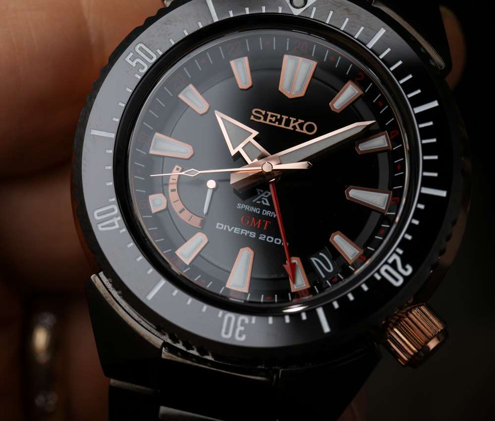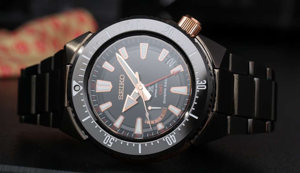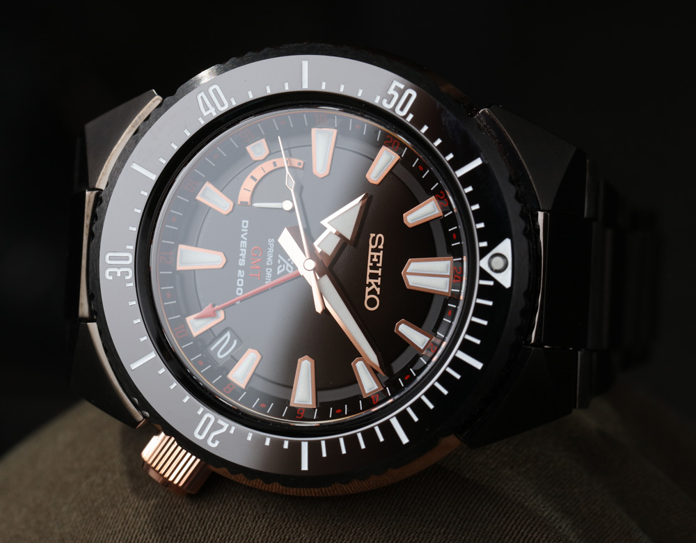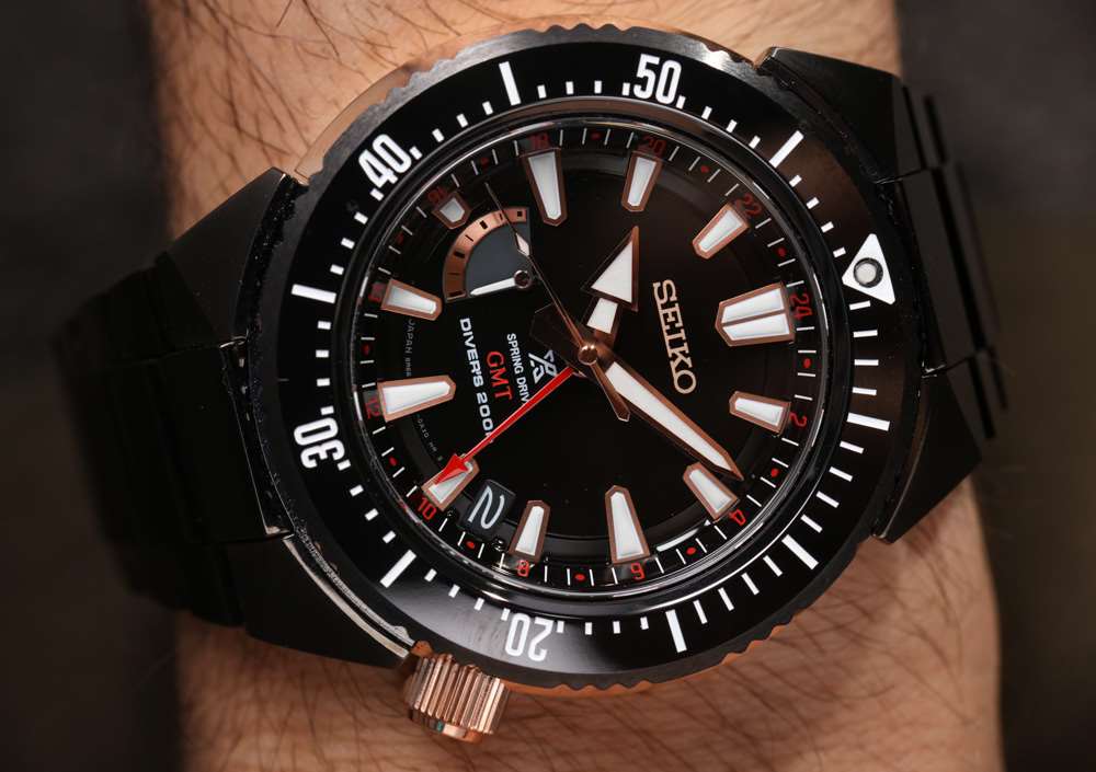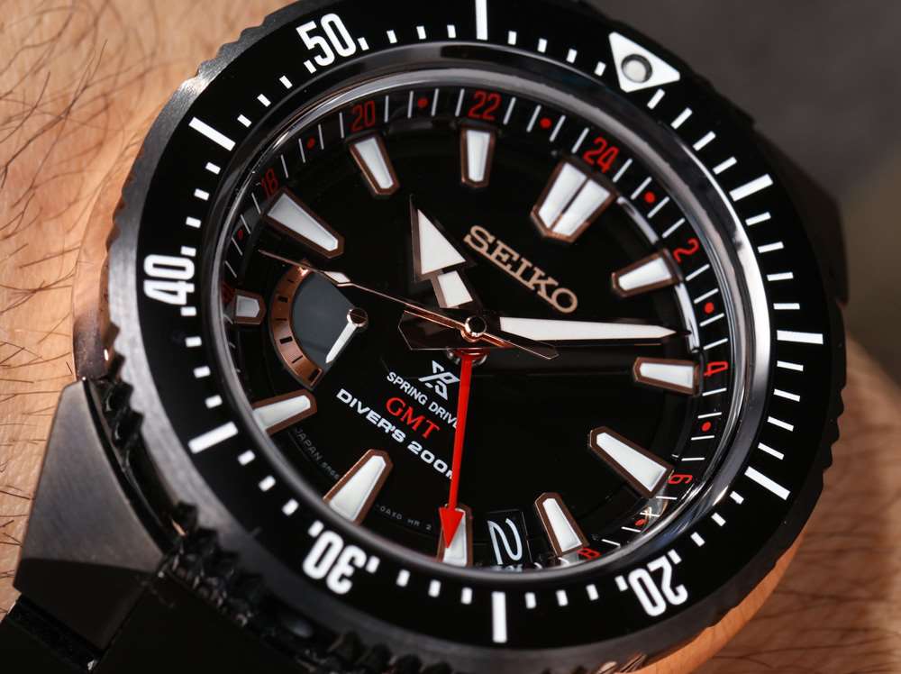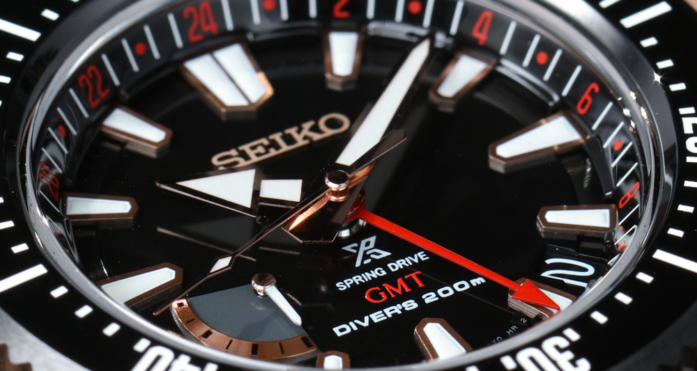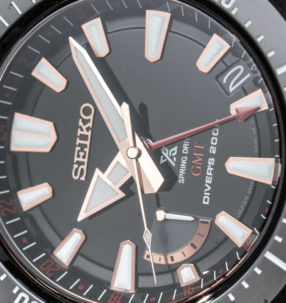 這款精工 Prospex 200M GMT 的特殊版本是參考 SBDB018,它采用略顯華麗的黑色,帶有玫瑰金色中層表殼和表盤(pán)裝飾。在平坦的 AR 涂層藍(lán)寶石水晶下,易讀性非常好。從易讀性的角度來(lái)看,紅色很有意義,但我認(rèn)為這款手表看起來(lái)會(huì)更精致一點(diǎn),紅色要少一點(diǎn)(只是個(gè)人喜好)。作為一款GMT腕表,傾斜的凸緣環(huán)上設(shè)有24小時(shí)標(biāo)記,日期窗口并沒(méi)有去除任何小時(shí)標(biāo)記,形成立體對(duì)稱。精工在黑色表盤(pán)上很好地使用了黑色日期盤(pán)……表盤(pán)上使用了精工專有的 Lumibrite lume(可能產(chǎn)生積極的發(fā)光效果)。
