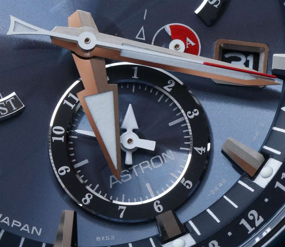 與 Astron 計(jì)時(shí)碼表一樣,精工 Astron GPS 太陽能雙時(shí)表盤大多是對(duì)稱的。一目了然,除了主時(shí)間外,表盤還提供日期、星期、電池充電指示和第二時(shí)區(qū)。精工將雙時(shí)功能設(shè)計(jì)為 12 小時(shí)格式,并有一個(gè)相應(yīng)的小表盤作為 AM/PM 指示器。初代 Astron 確實(shí)具有雙時(shí)間功能,但它采用 24 小時(shí)格式。更重要的是設(shè)置(而不是調(diào)整)時(shí)區(qū)很簡(jiǎn)單。精工設(shè)計(jì)的 8X 系列機(jī)芯不是完全手動(dòng)調(diào)整時(shí)間,而是根據(jù)與 GPS 信號(hào)同步后的準(zhǔn)確性,在不同時(shí)區(qū)之間更改時(shí)間。