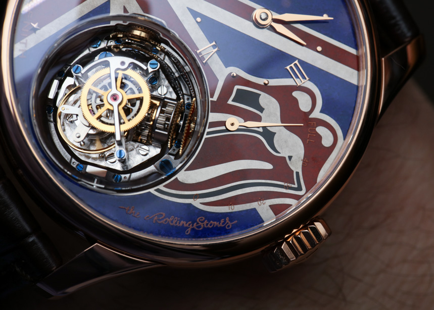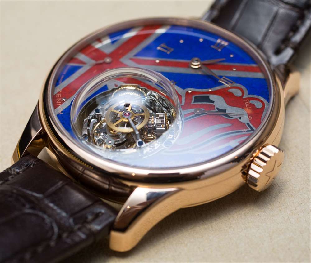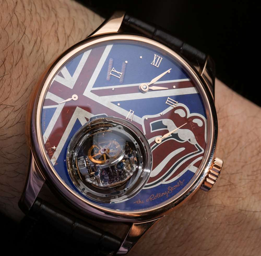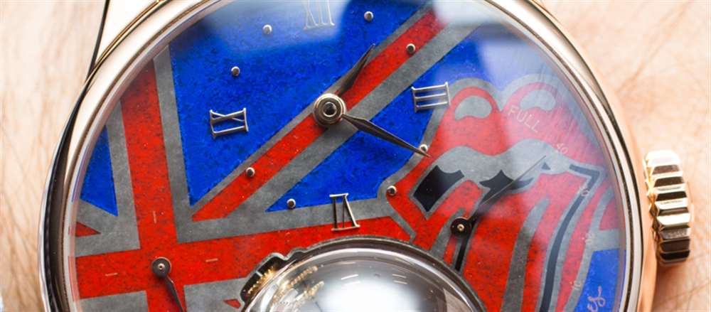 帶有滾石樂隊(duì)的標(biāo)志、張開嘴巴的標(biāo)志和英國國旗,每個(gè)表盤都是手工琺瑯,在指針和索引標(biāo)記上涂有金色貼花。如果您真的很喜歡滾石樂隊(duì),那肯定是一個(gè)很酷的概念。