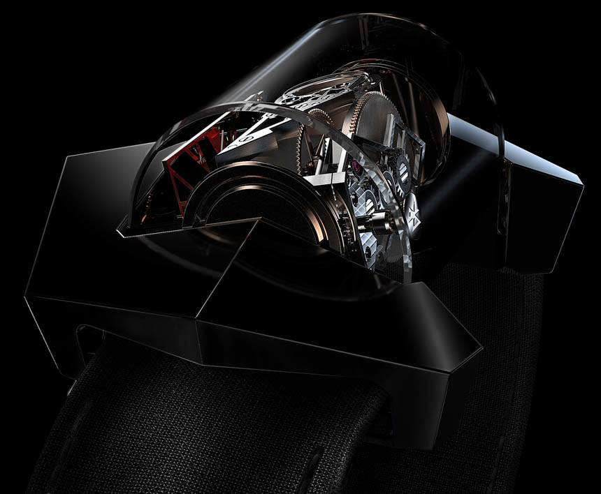 一個看起來像剃須刀的組件有三個“刀片”,尖端鑲有 PAC-MAN 風格切割的合成紅寶石球體。在球體的這些切割空間中,刀片前后移動,連接到一個圓柱體以模擬擺輪的擺動拱形。與傳統擺輪相比,您可以看到振幅有多短。此外,連接到葉片諧振器的是一個擒縱系統,該系統利用其直接脈沖系統模擬天文鐘擒縱系統的優勢。直到最近幾年,我們才開始在腕表中看到傳統的棘爪式擒縱機構。可以說,天文鐘式擒縱機構對于總體計時結果來說更好,但很難設計到腕表中,因為它們對運動和震動非常敏感。