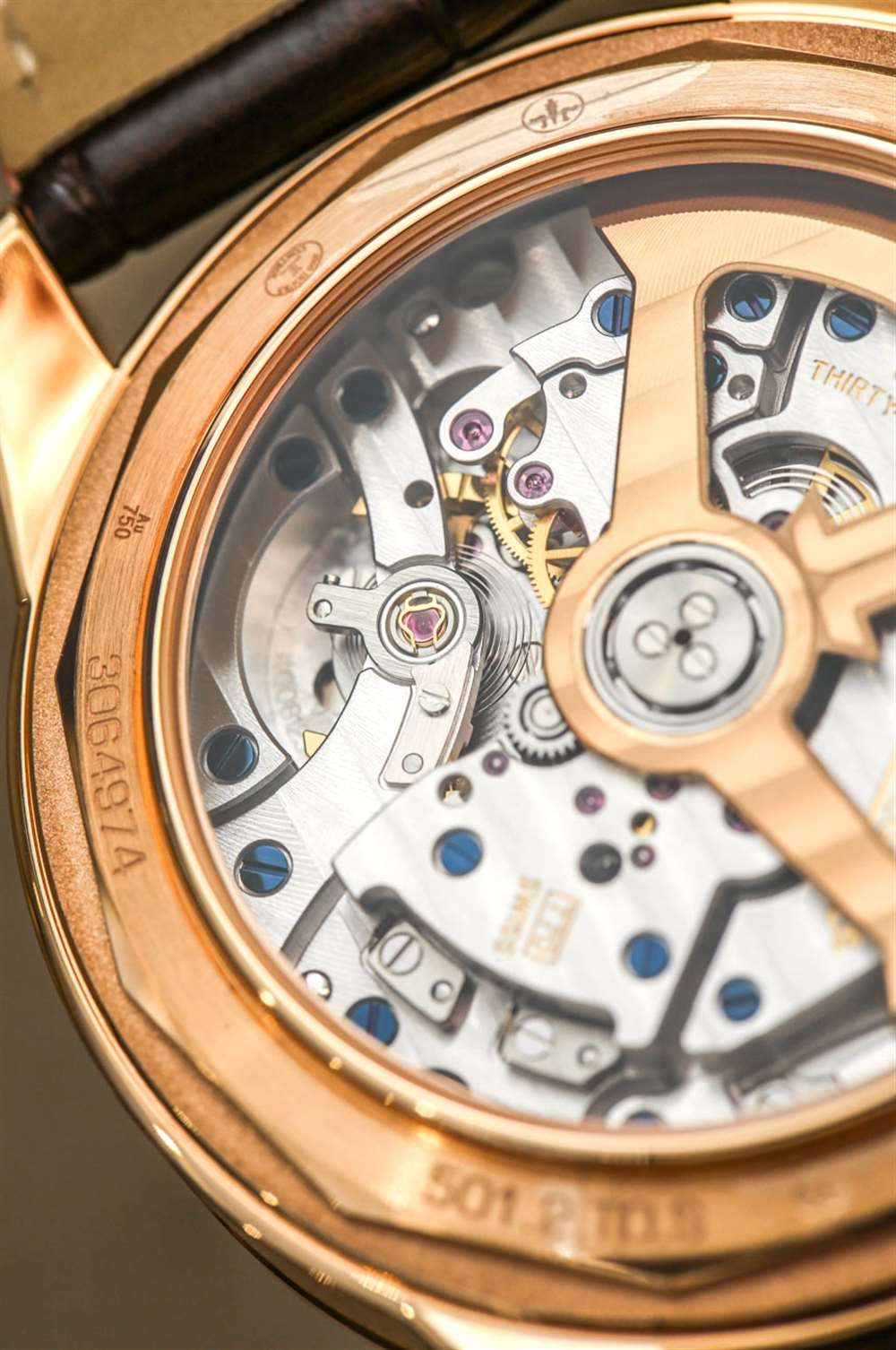 Jaeger-LeCoultre 將他們的新平衡輪稱為“Gyrolab”。新的平衡輪結構旨在減少金屬,因此比傳統(tǒng)振蕩器更具空氣動力學特性。我碰巧發(fā)現(xiàn)帶有方頭的微型擺輪螺絲特別酷。透過積家 Geophysic True Second 的藍寶石水晶底蓋窗口,您可以看到精鋼和黃金版本腕表均配備純金自動擺陀的機芯。