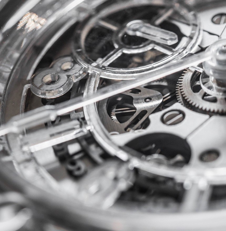 看著已經鏤空的表盤,感覺就像看到 Hublot Big Bang UNICO 手表的 X 光片。指針和時標上的涂漆 SuperLumiNova 保持了易讀性,但這里的概念是完全透明的……而且它有效。起初,看到透明指針在表盤上移動有點奇怪,但老實說,Jean-Claude Biver 是對的,這與全黑手表相反,但感覺很適合完全相同的主題。