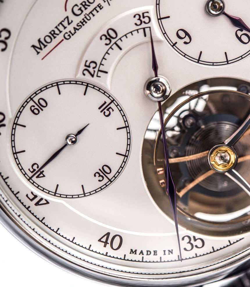知道這一點應該有助于欣賞 Moritz Grossmann BENU 陀飛輪的一些細微差別,例如 Moritz Grossmann 在內部生產精美的火焰色指針,以及他們獨特的陀飛輪機構有一個停秒系統,字面上使用一個與擒縱機構相連的小刷子以暫停它。這與 A. Lange & Sohne 多年前設計的為陀飛輪提供停秒功能的系統并不完全不同,但 Moritz Grossmann 的做法略有不同。