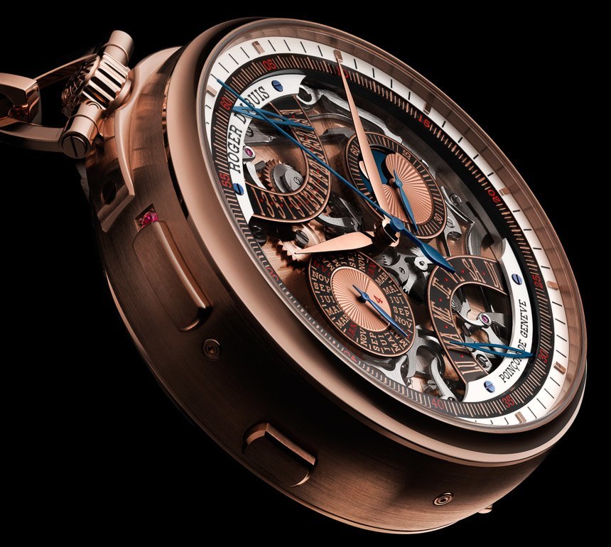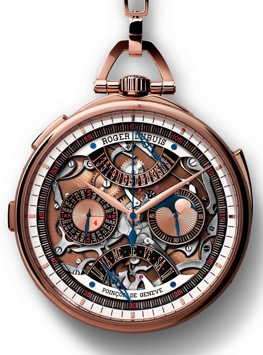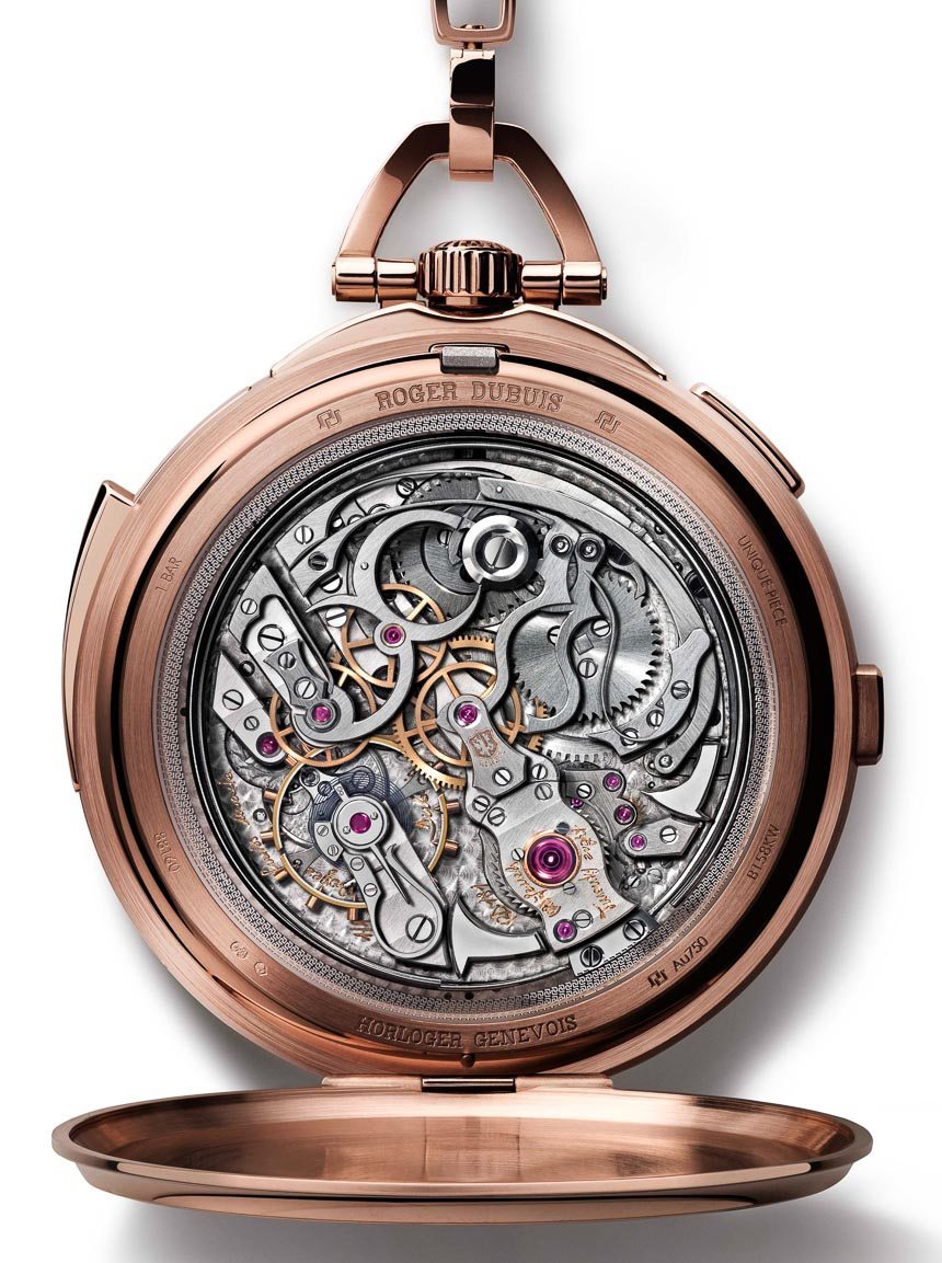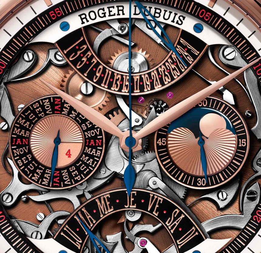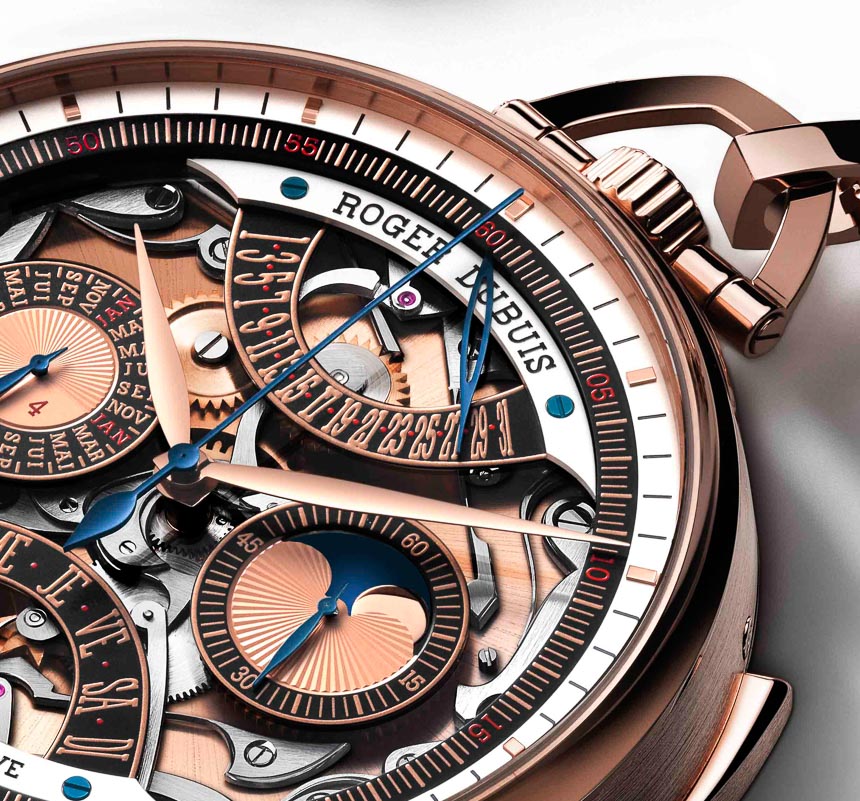 Roger Dubuis 進一步聲稱,大約 1,950 小時的人工時間用于修復和重新設計以 18,000 bph 運行并由 558 個零件生產的機芯。該機芯具有時間、單按鈕計時碼表、帶逆跳指示器的萬年歷、月相指示器和三問報時功能。鑒于 Roger Dubuis 是日內瓦印記的全部,RD181 也帶有“Poin?on de Genève ”。印章的部分標準是隨著時間推移的準確性。話雖如此,看到 Roger Dubuis 聲稱以下內容很有趣(具有諷刺意味的是,它的手腕時間適用于懷表):