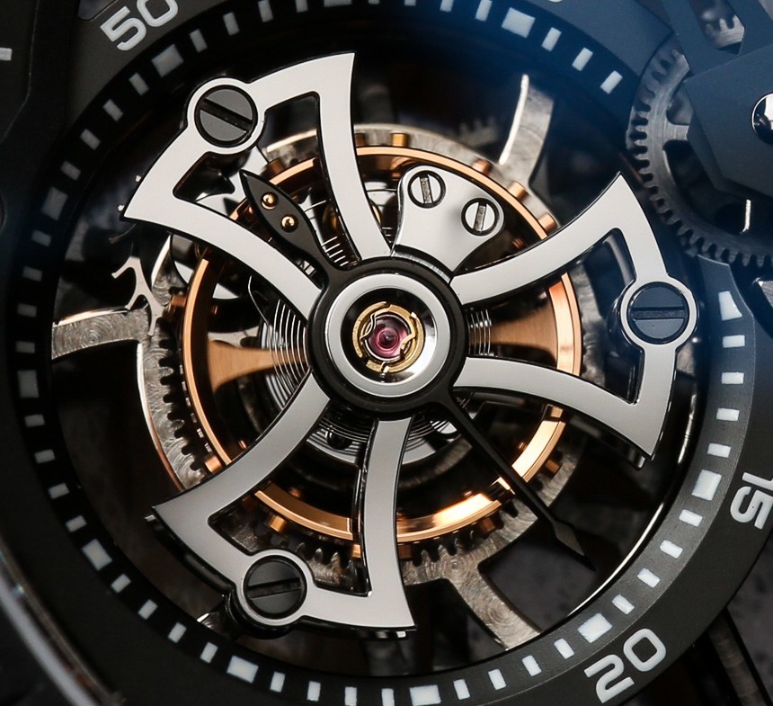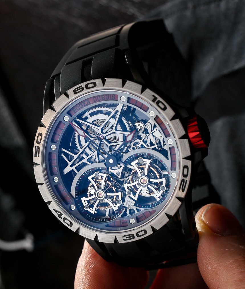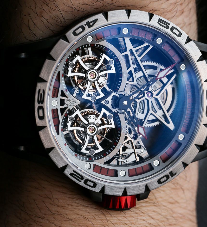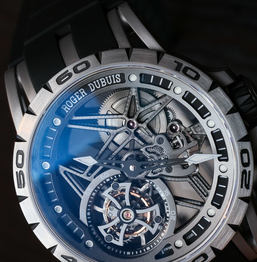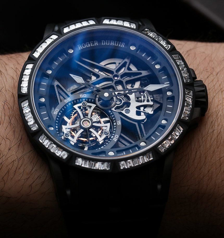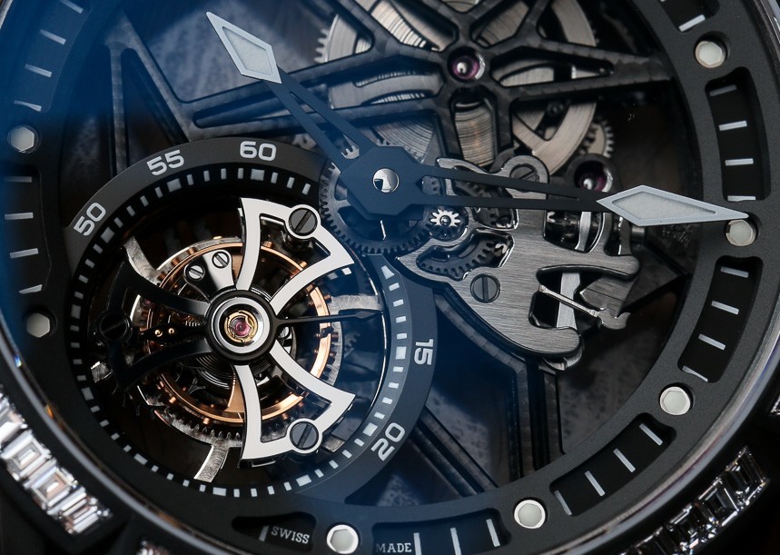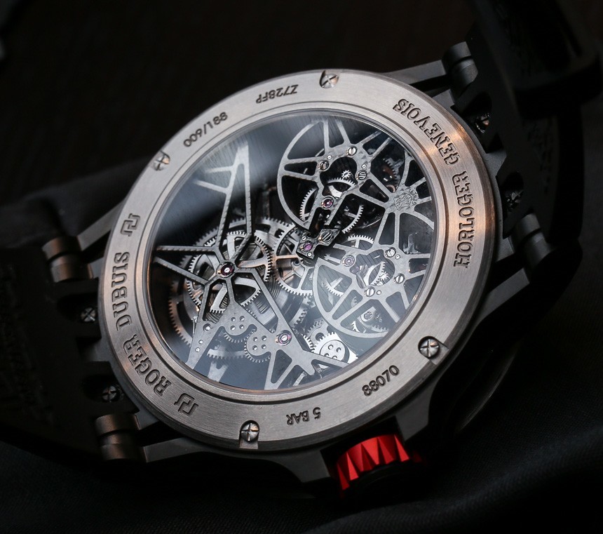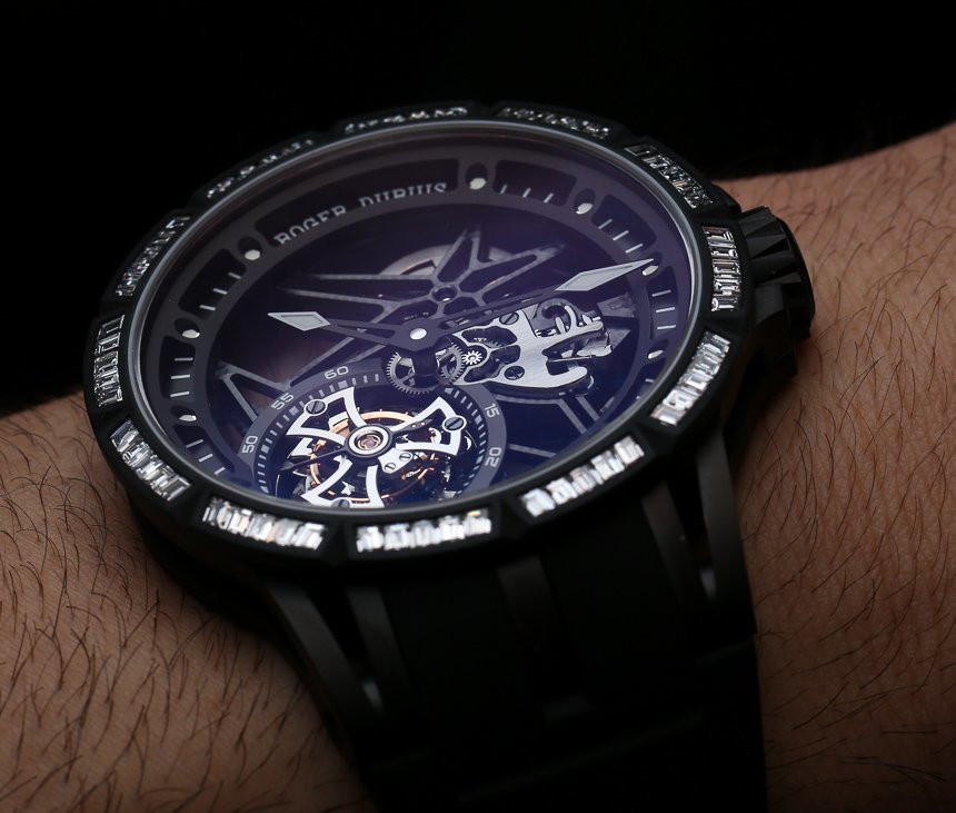 沿著這條道路,該品牌在 2015 年推出了另一項有趣的“創新”,值得作為奢侈手表制造商容易興奮的例子。2015 年 Roger Dubuis Excalibur Spider Skeleton Flying Tourbillon 腕表中的一款配備“寶石鑲嵌橡膠表圈”(參考號 DBEX0480)。這款 45 毫米寬的黑色 DLC 涂層鈦金屬腕表采用橡膠涂層表圈,還鑲嵌有 60 顆長方形切割鉆石(總重約 2.24 克拉)。閃亮的大寶石與橡膠的啞光黑色表面形成鮮明對比,將一定程度的運動感與珠寶浪漫融為一體。您要么“明白”,要么不明白,但了解該產品的目標用戶是一件很有趣的事情。手表內部是內部制造和手動上鏈的 Roger Dubuis 口徑 RD505SQ 鏤空機芯,帶有時間和飛行陀飛輪。