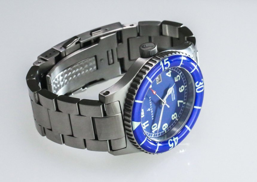 Prometheus Sailfish 寬 42 毫米,并不是一款超大手表,但由于其沉重的表殼和寬大的鋼表鏈,它確實(shí)非常耐磨。Prometheus Sailfish 表殼的主要問(wèn)題是凸耳伸出的程度(表殼長(zhǎng) 52 毫米)。它們不僅間距很大,而且沒(méi)有像應(yīng)有的那樣向下彎曲。這在視覺(jué)上造成了手表的一些奇怪比例,并且從佩戴的角度來(lái)看,表殼對(duì)于小手腕和大多數(shù)中等尺寸的手腕來(lái)說(shuō)會(huì)伸出太遠(yuǎn)。話雖如此,我會(huì)說(shuō)手腕較大的人會(huì)覺(jué)得 Sailfish 佩戴舒適,但手腕較小的人在購(gòu)買前一定要試戴一下。